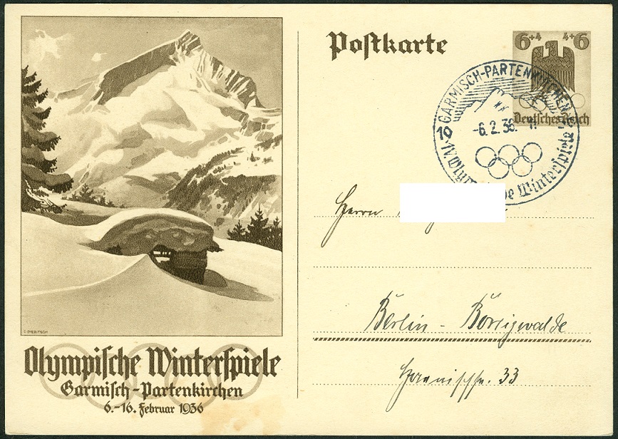 Zu den Winterspielen in Garmisch-Partenkirchen, vom 6.-16. Februar 1936, brachte die Reichspost 2 Sonderpostkarten an die Schalter:katalogisiert als P 257 und P 258.