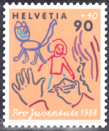 Auf dieser Marke der Schweiz (MiNr 1384) ist ´keine Kinderzeichnung abgebildet, sie passt aber trotzdem in eine solche Sammlung. Zu sehen ist ein Kind beim Zeichnen.