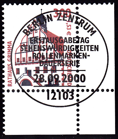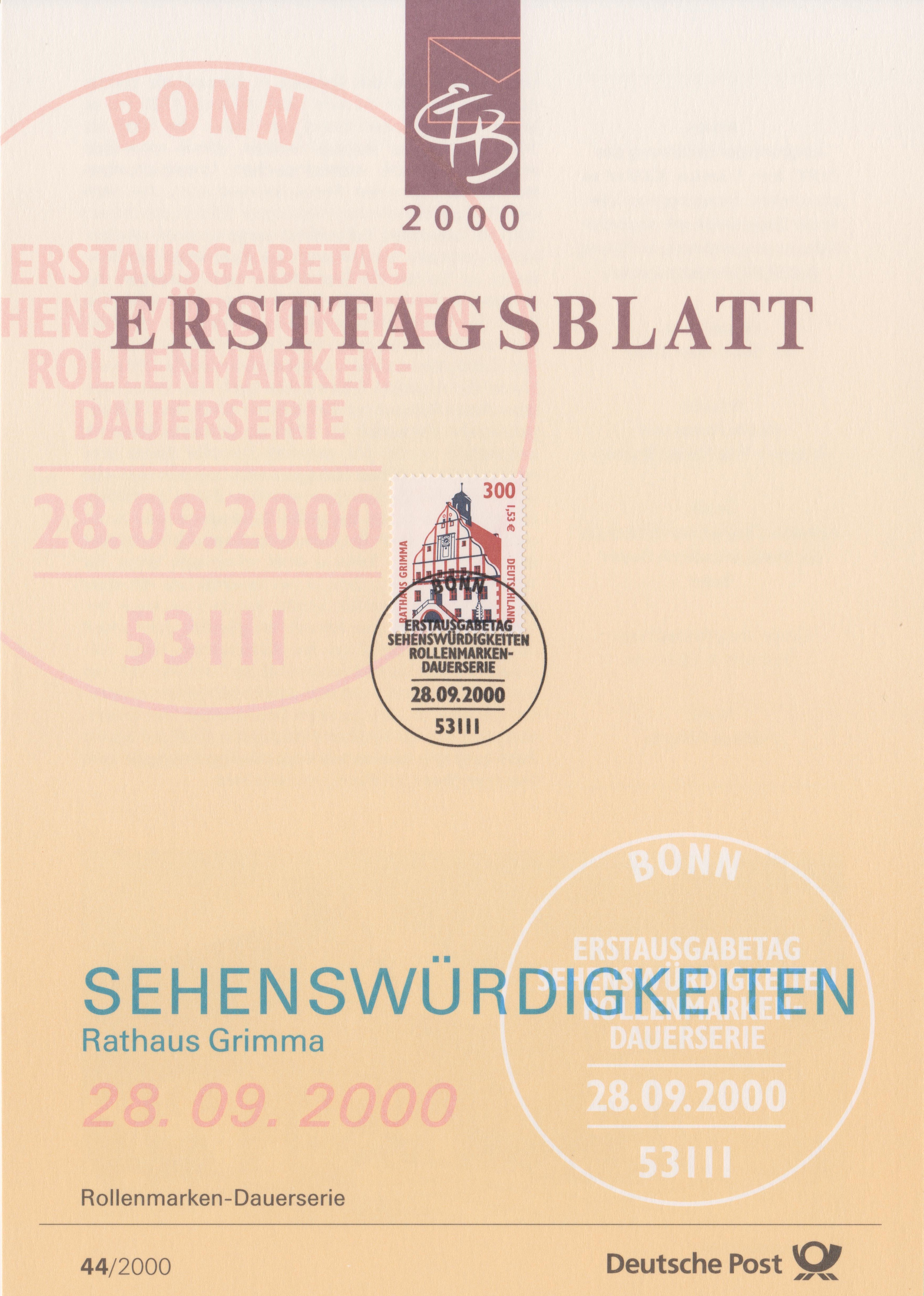 Am 28.9.2000 wurde die Marke zu 300Pf/1,53 € verausgabt, sie zeigt als Motiv das Rathaus, Grimma.