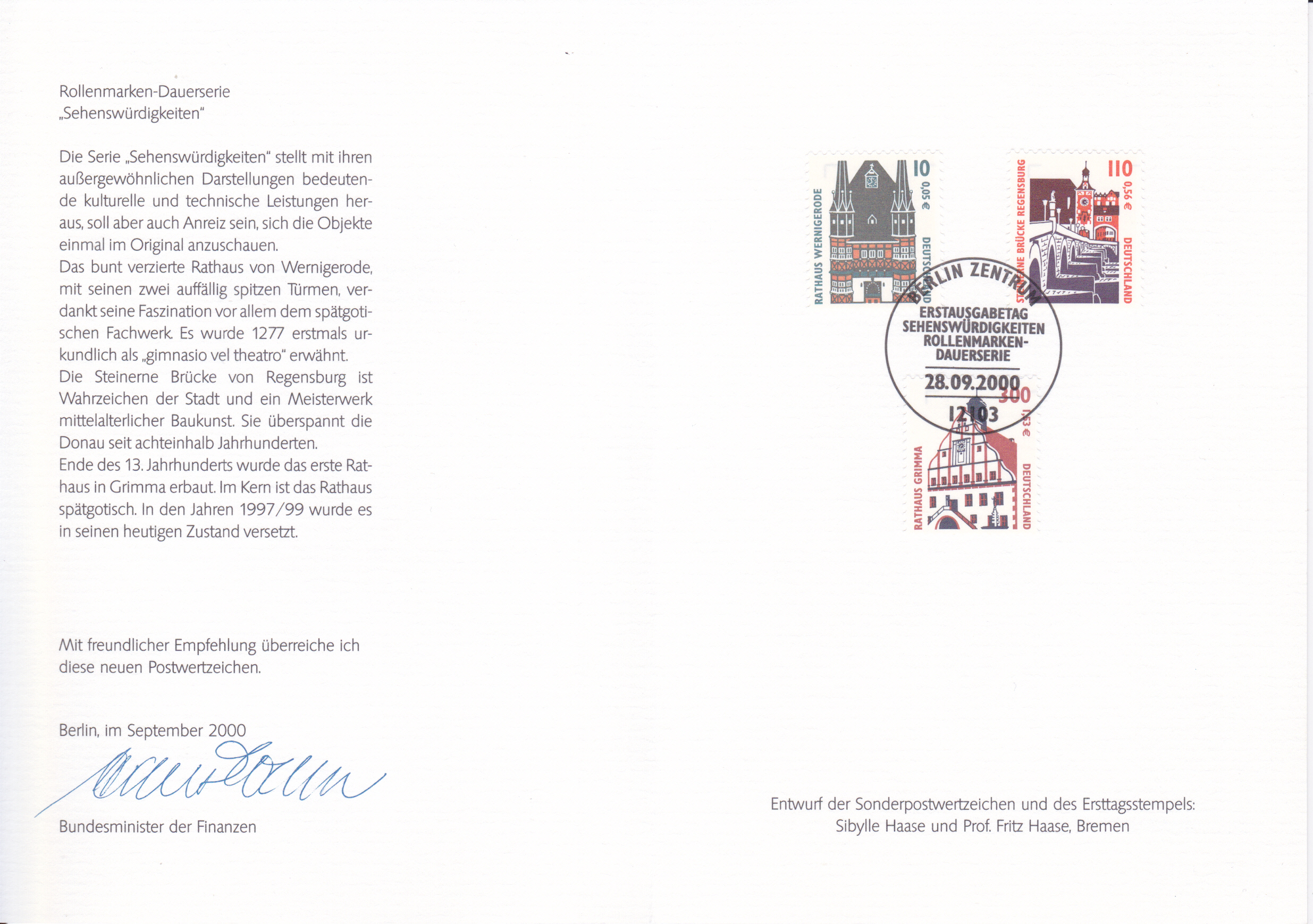 Ministerkarte des Finanzministers mit je einer Marke zu 10Pf/0,05€, 110Pf/0,56€ und 300Pf/1,53€ (MiNr 2139 A, 2140 und 2141 A) der Dauerserie "Sehenswürdigkeiten" und dem Ersttagsonderstempel Berlin.