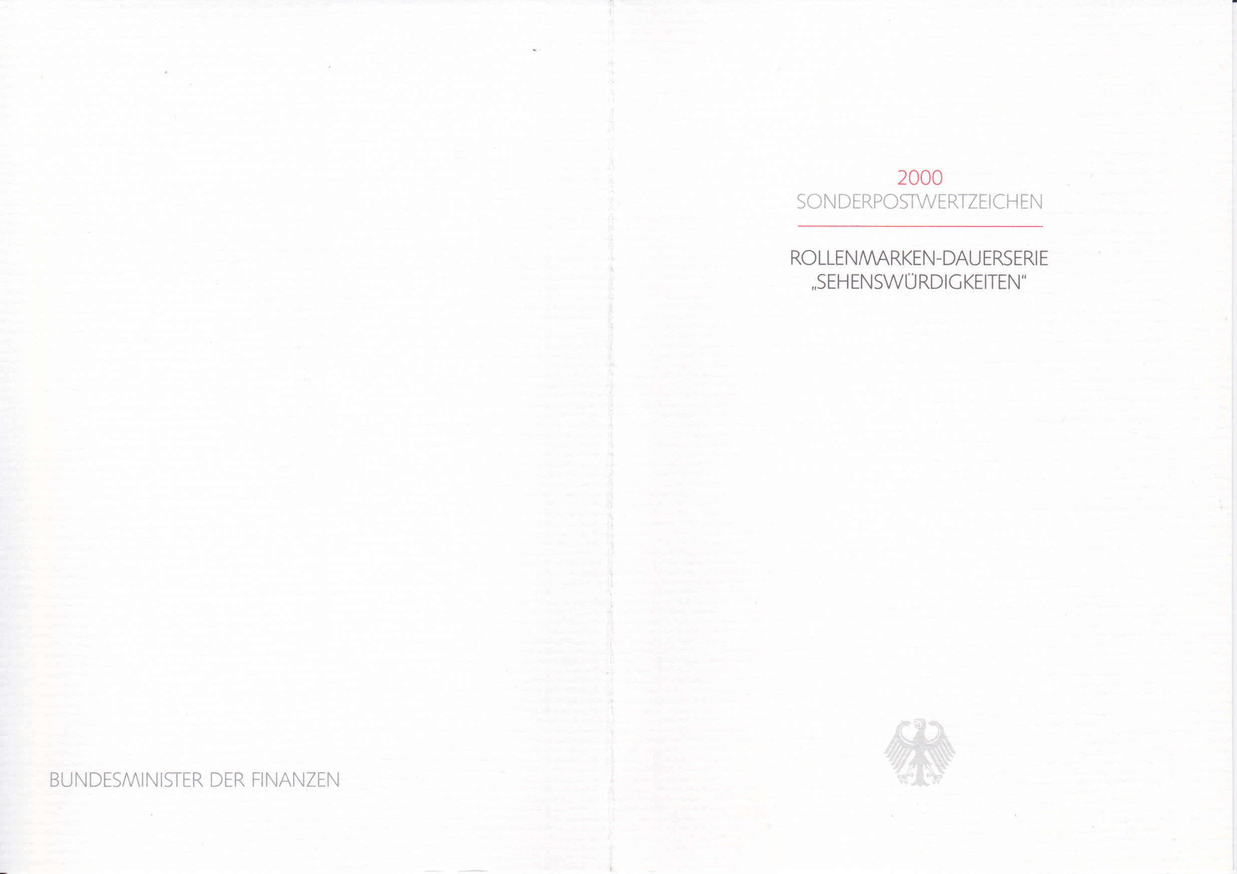Auf ETB 44/2000 wurde Bund MiNr. 2141 entwertet per Stempel "BONN 53111 ERSTAUSGABETAG SEHENSWÜRDIGKEITEN ROLLENMARKEN-DAUERSERIE":