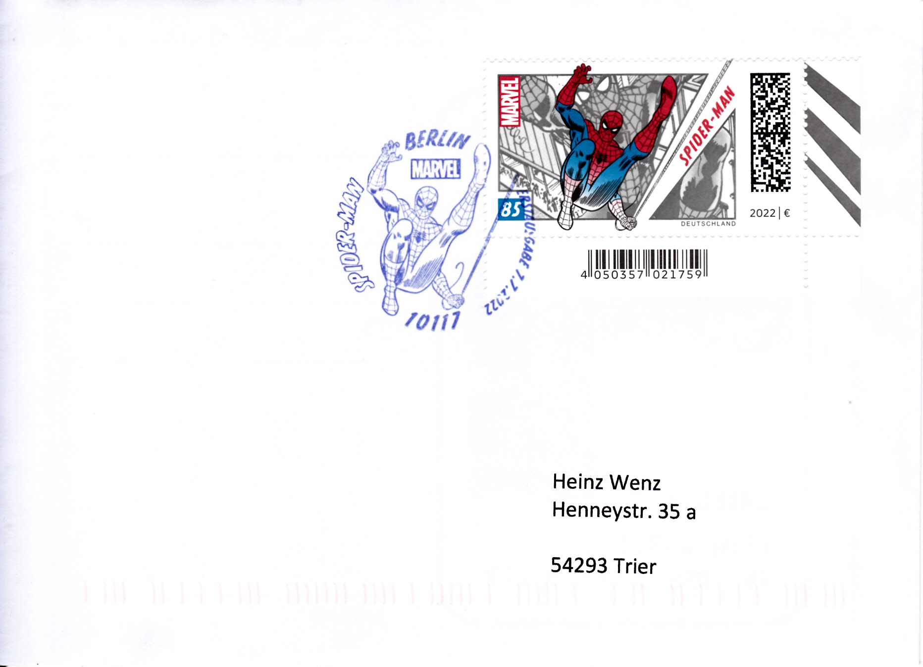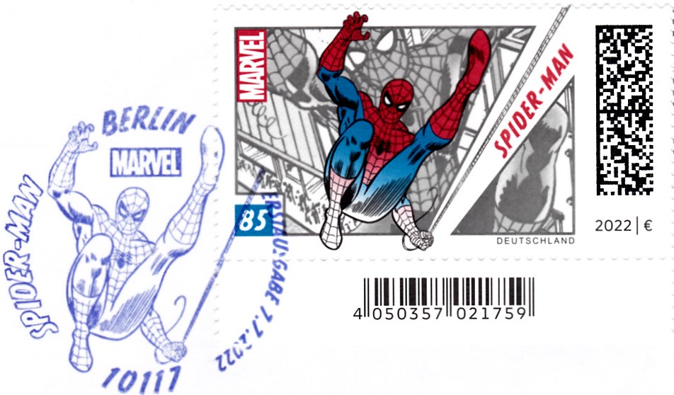Bei der Deutschen Post erschien die erste Marke der Serie "Superhelden" (MiNr 3697) mit der Abbildung "Spider-Man über den Straßen von New York City". Ich zeige hier ein Eckrandstück mit EAN-Codierung.