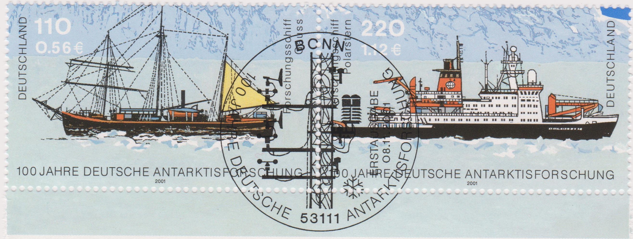 Block 57 erschien am 08.11.2001 zum Thema 100 Jahre deutsche Antarktisforschung. Er enthält 2 Marken, eine zu 110 Pf / 0,56 € Motiv „Forschungsschiff Gauss“ und eine zu 220 Pf / 1,12 € Motiv „Forschungsschiff Polarstern“.