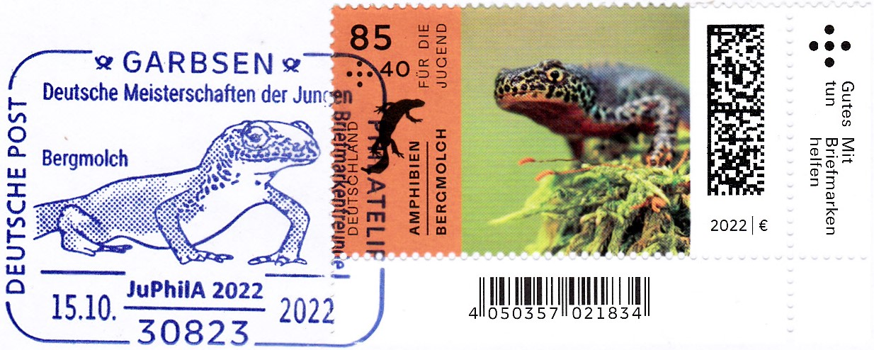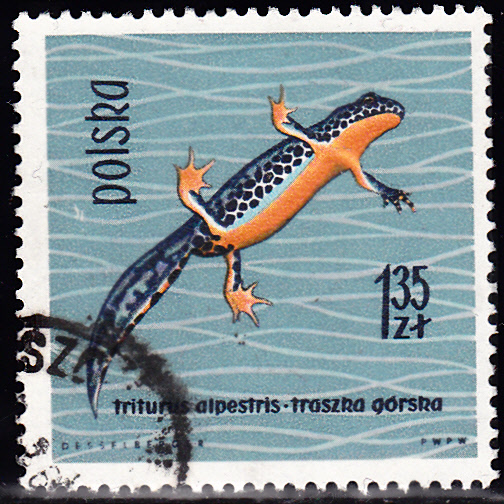 Diese Marke aus Polen (MiNr 1399) zeigt einen Bergmolch (Ichthyosaura alpestris).