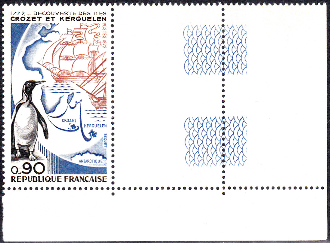 Eine Marke aus Frankreich (MiNr 1780) zum 200. Jahrestag der Entdeckung der Crozet- und Kerguelen-Inseln zeigt einen Lagekarte der Inseln, Segelschiffe und einen Königspinguin (Aptenodytes patagonicus).