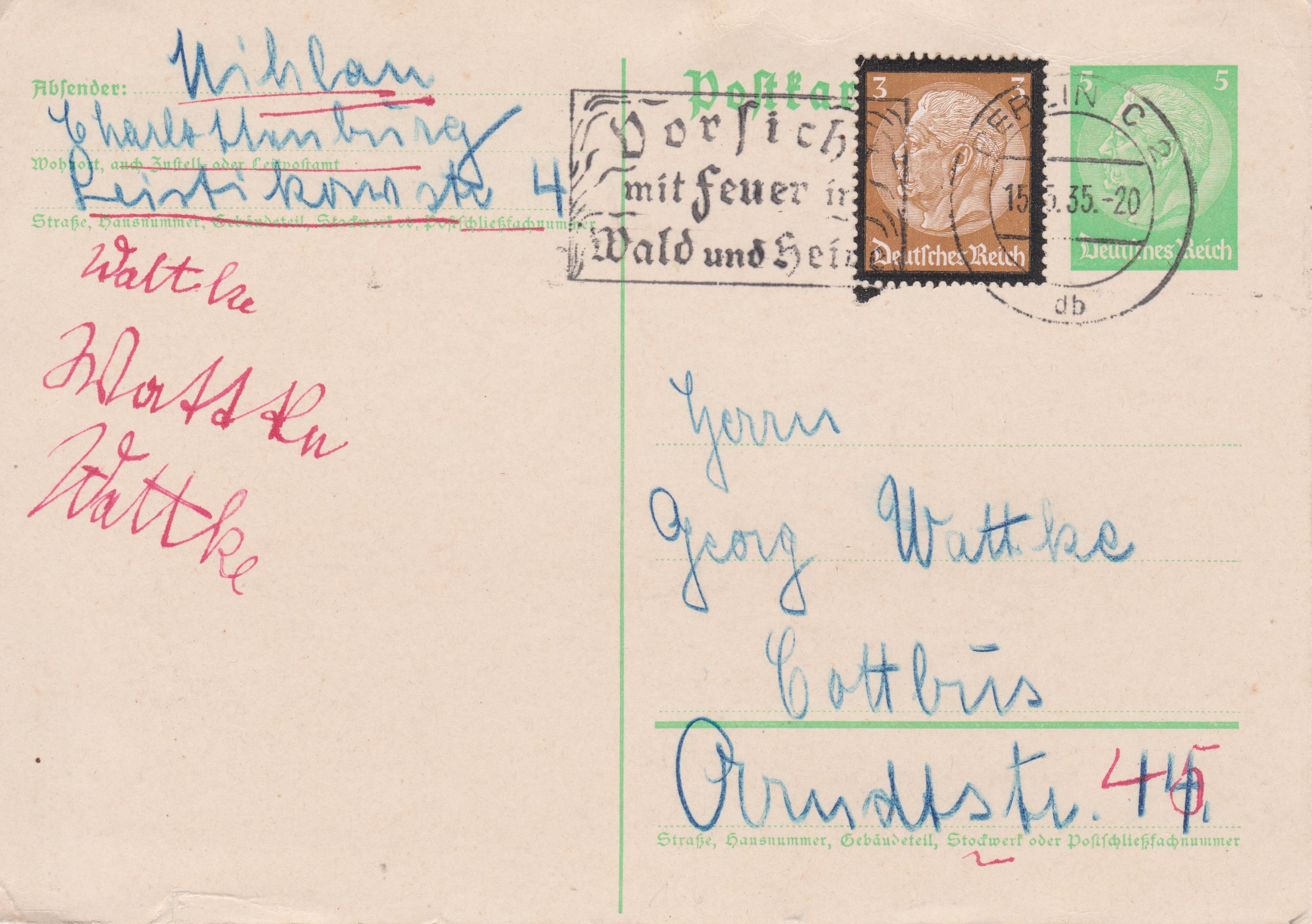 Ganzsache mit Eindruck eines Wertzeichens der Wertstufe 5 Pf der Dauerserie Hindenburg mit Zusatzfrankatur 3 Pf Dauerserie Hindenburg mit Trauerrand am 15.05.1935 verwendet auf Postkarte im Fernverkehr, Portostufe 6 Pf, somit um 2 Pf überfrankiert: