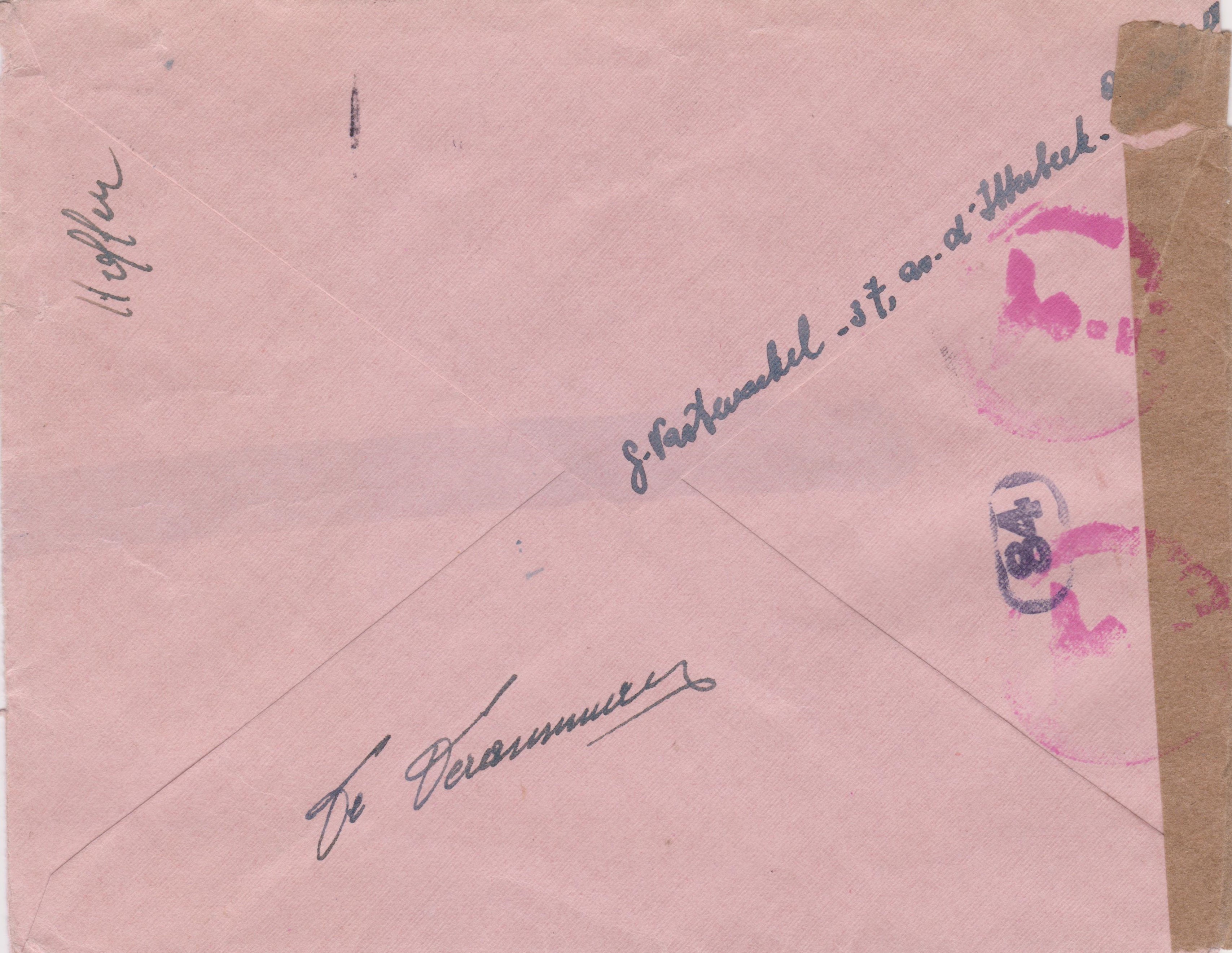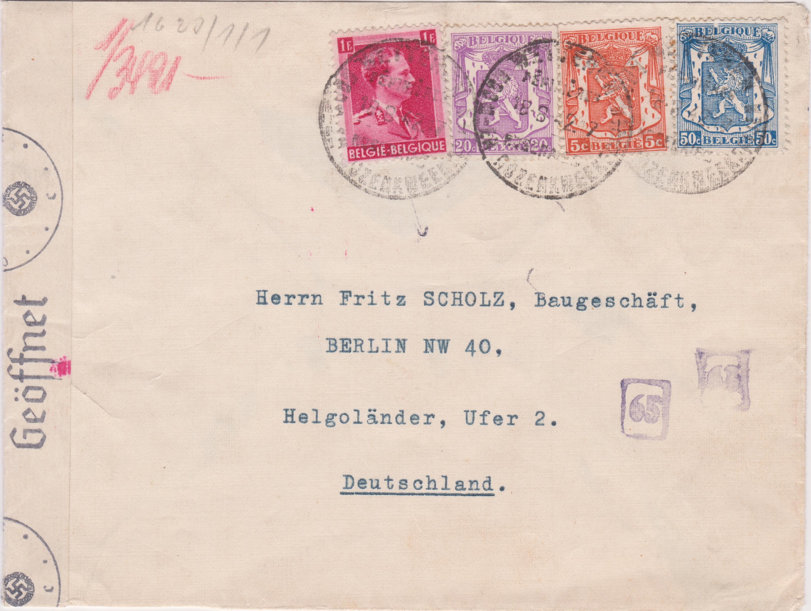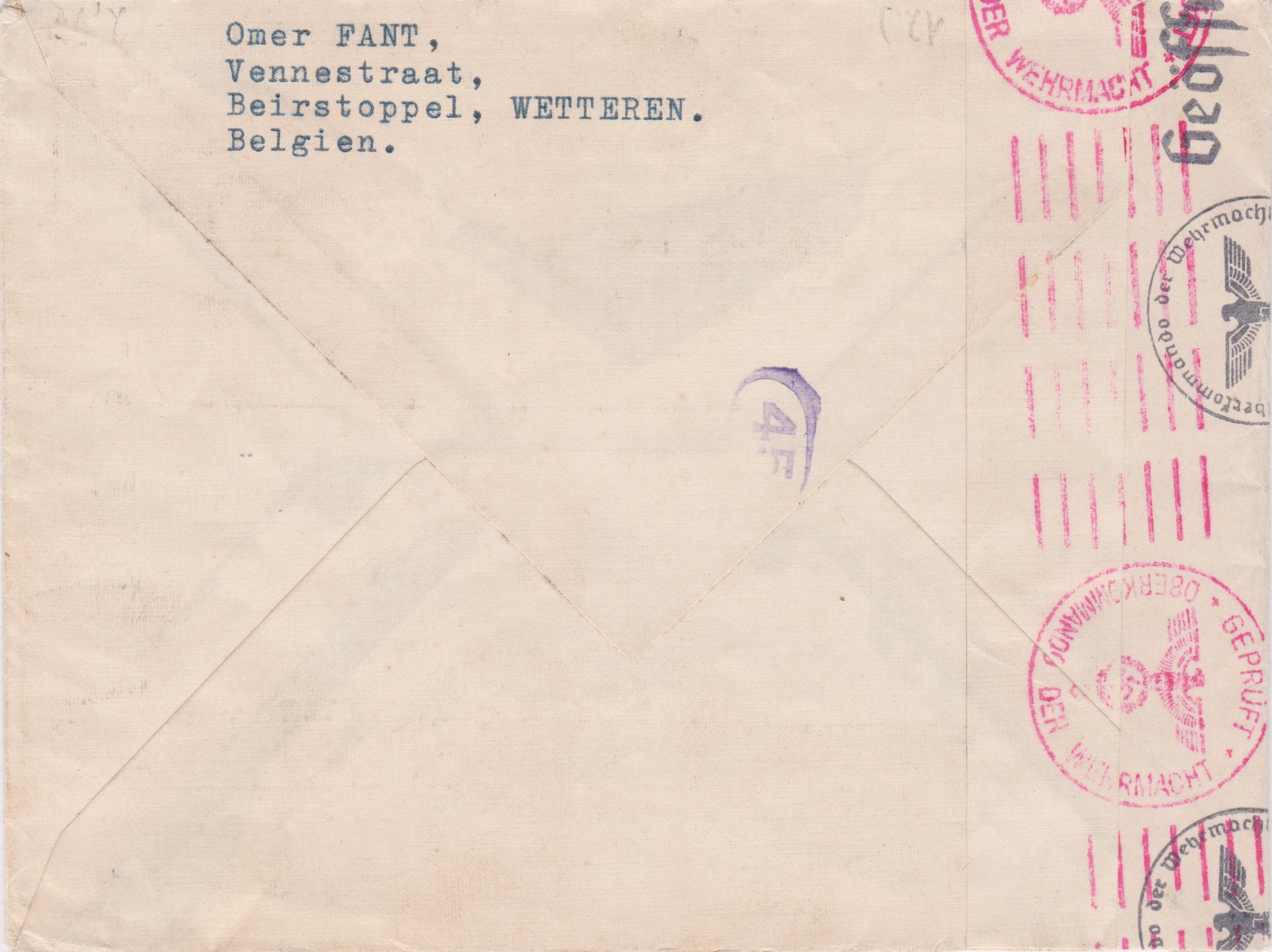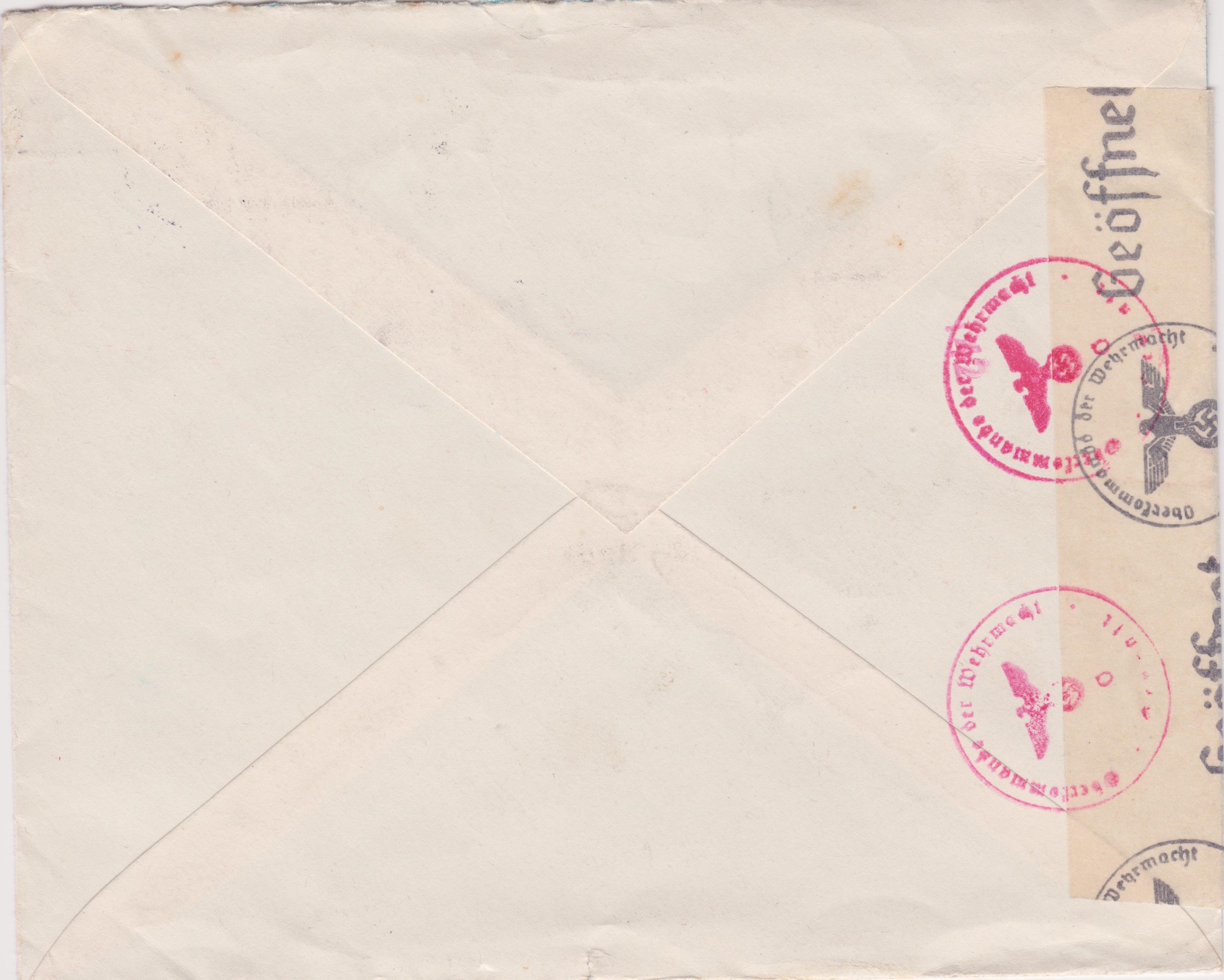 In der ABP Köln wurde der Beleg linksseitig geöffnet und nach erfolgter Überprüfung mit einem Klebestreifen wieder verschlosssen, was per Maschinenstempel "GEPRÜFT OBERKOMMANDO DER WEHRMACHT C" in Rot, Landsmann CPM1.1, dokumentiert wurde.