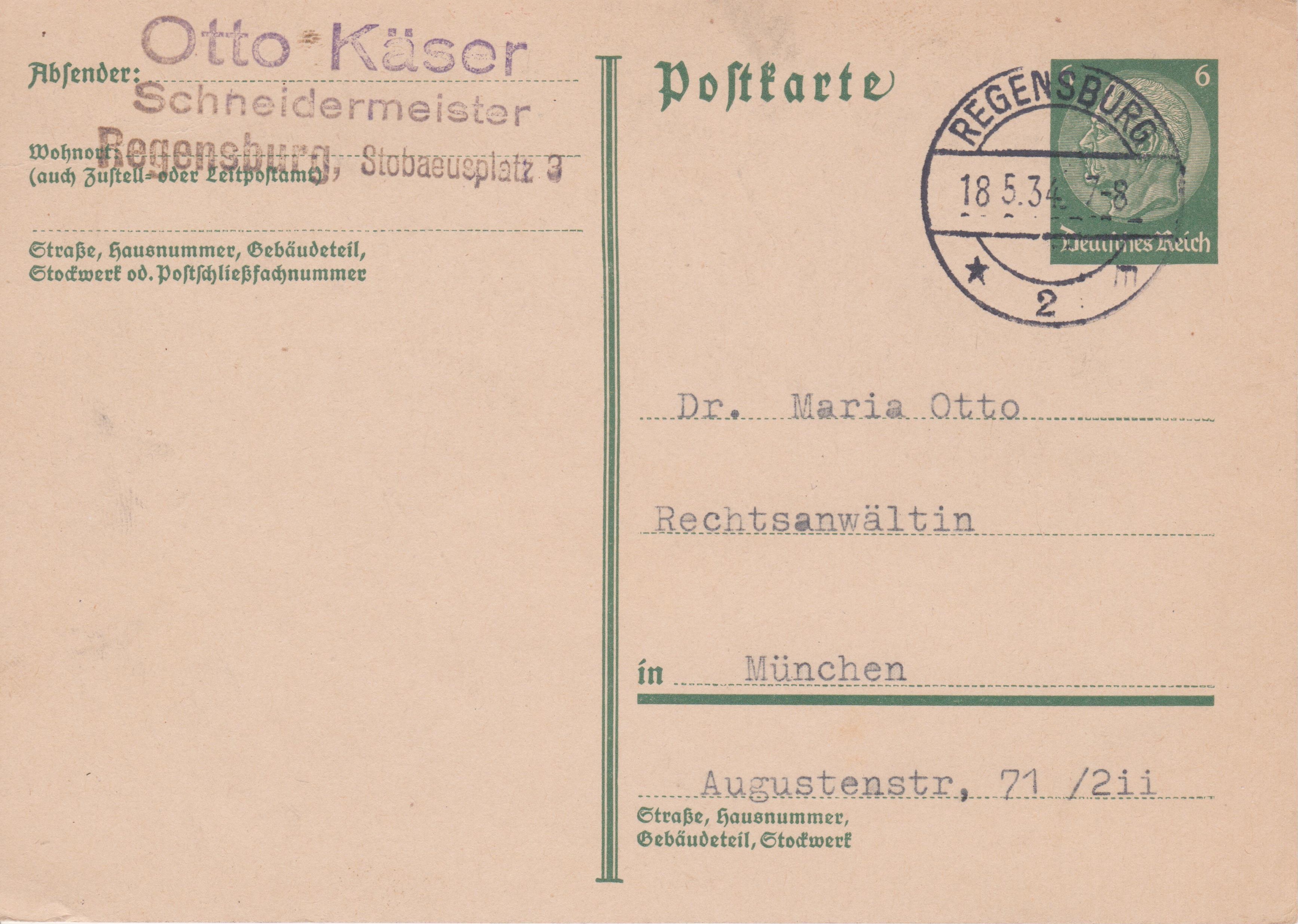 Deutsches Reich Ganzsache 6 Pf Dauerserie Hindenburg, "e" von "Postkarte" mit langem Schlussstrich, MiNr. P 218 I, am 18.05.1934 mit Tagesstempel "REGENSBURG":