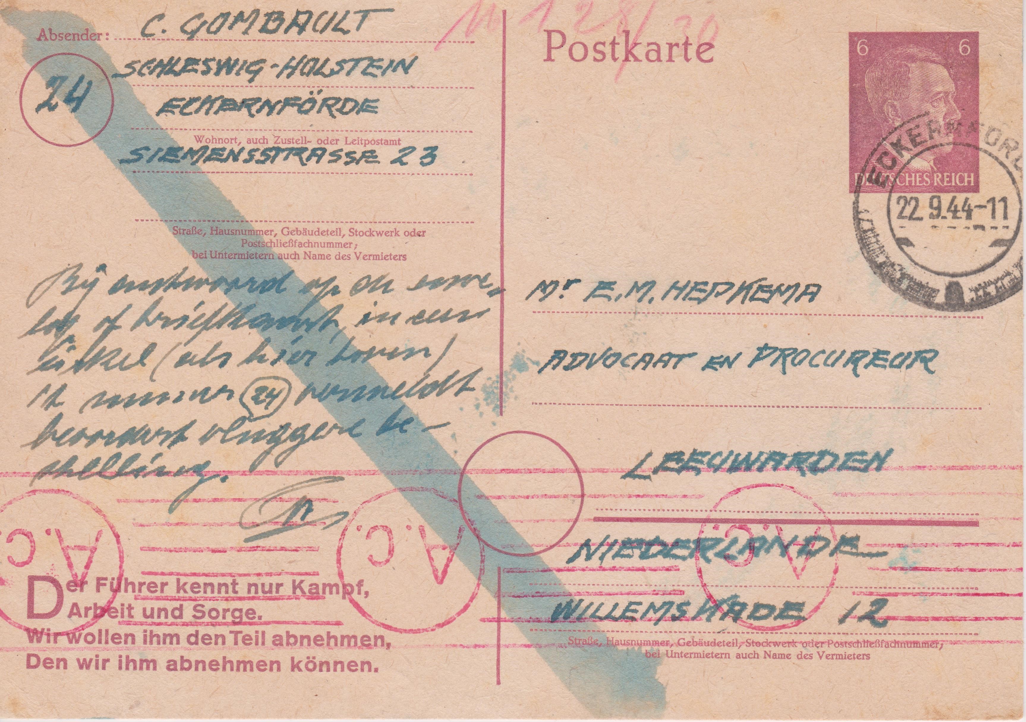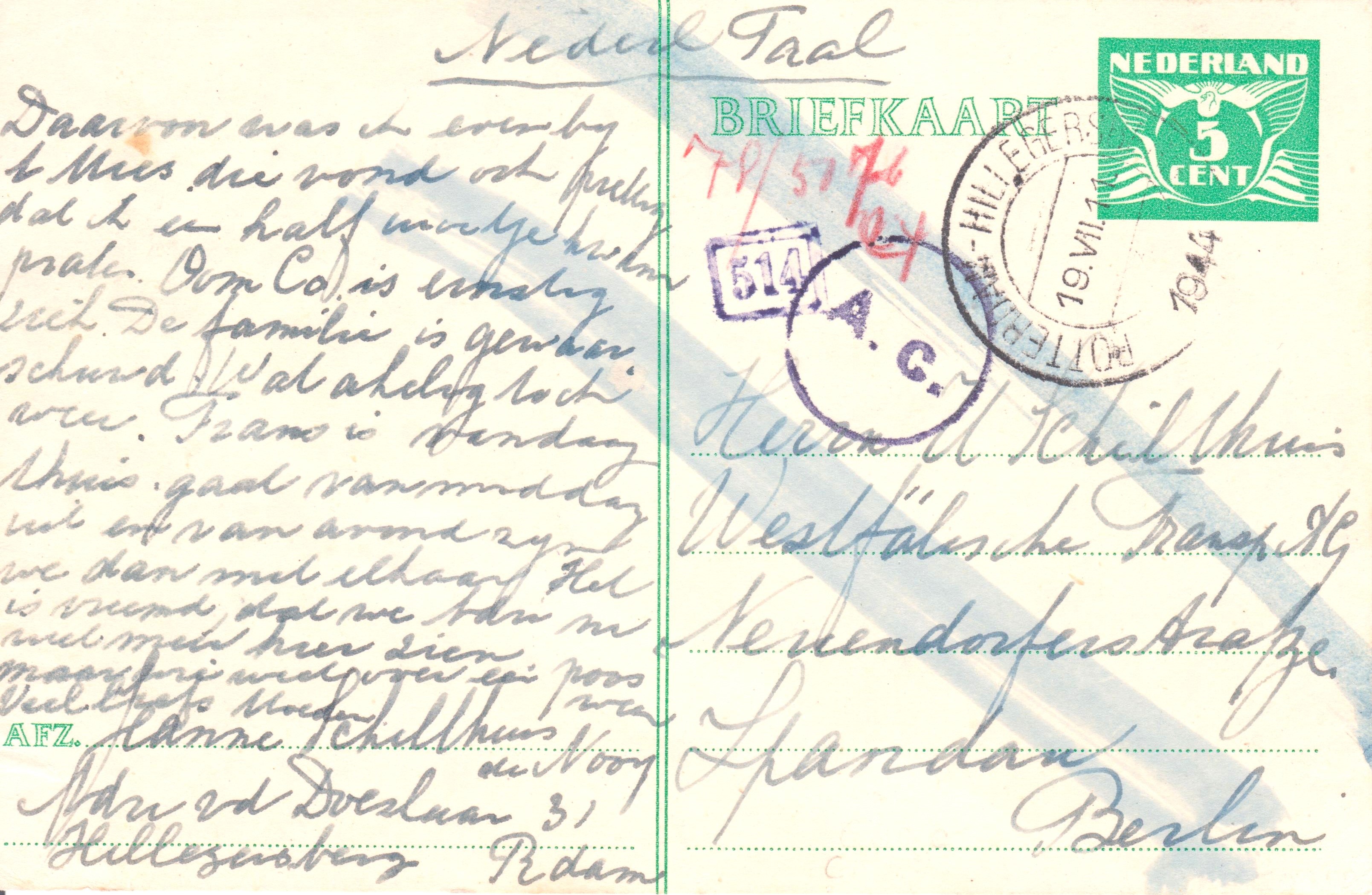 Am 14.01.1944 kam diese Postkarte dann an ihrem Bestimmungsort "MIDDELBURG" an.