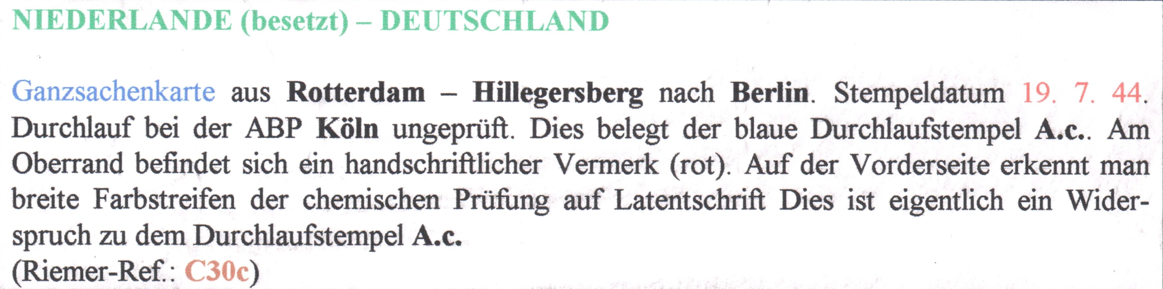 Der Beleg wurde der ABP Köln zugeleitet, wo vorderseitig ein Handprüfstempel "C 10" in Rot abgeschlagen wurde.