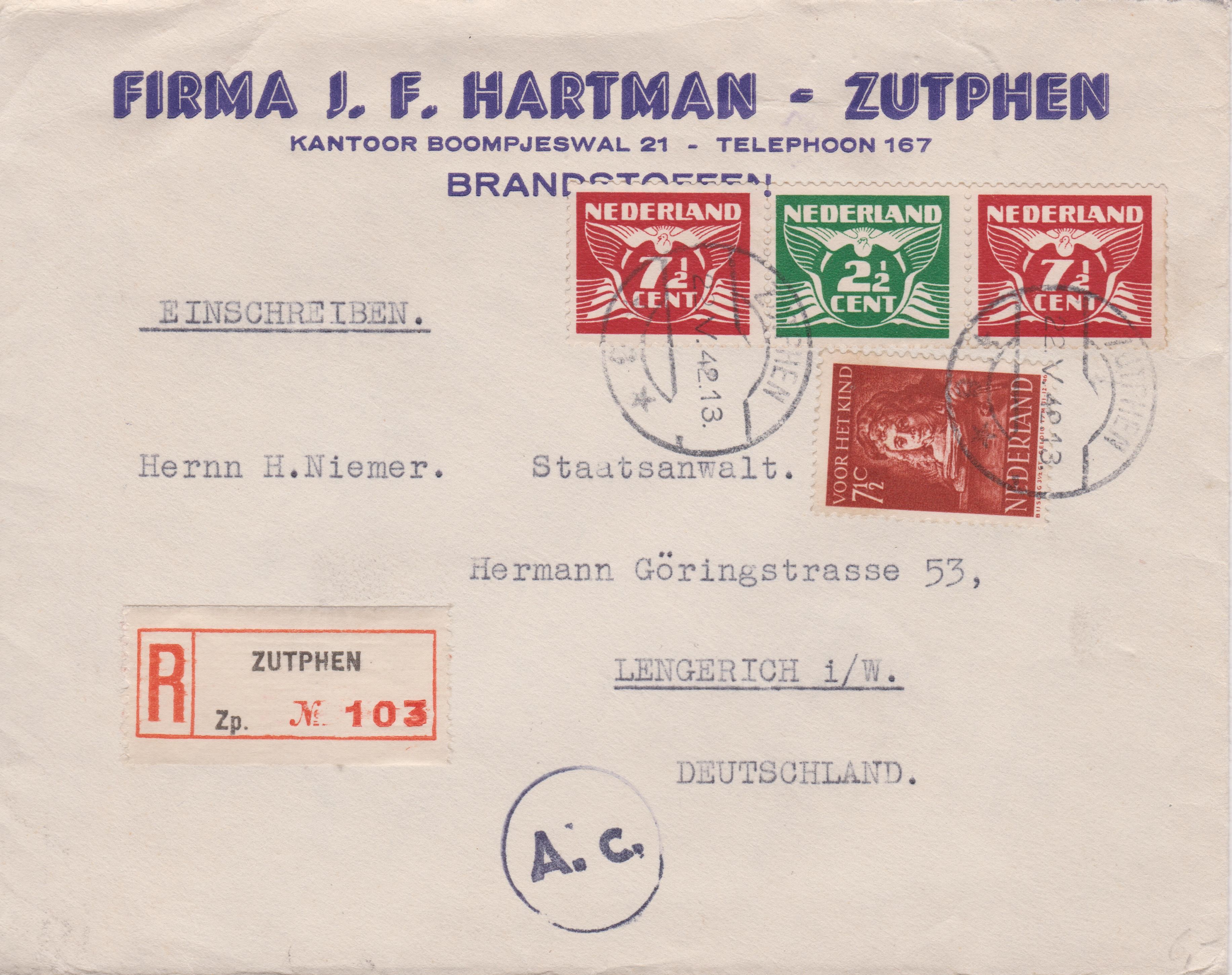 Postkarte per Einschreiben nach "Middelburg" in Holland, frankiert mit 38 Pf, aufgegeben am 29.12.1943 in POTSDAM 1: