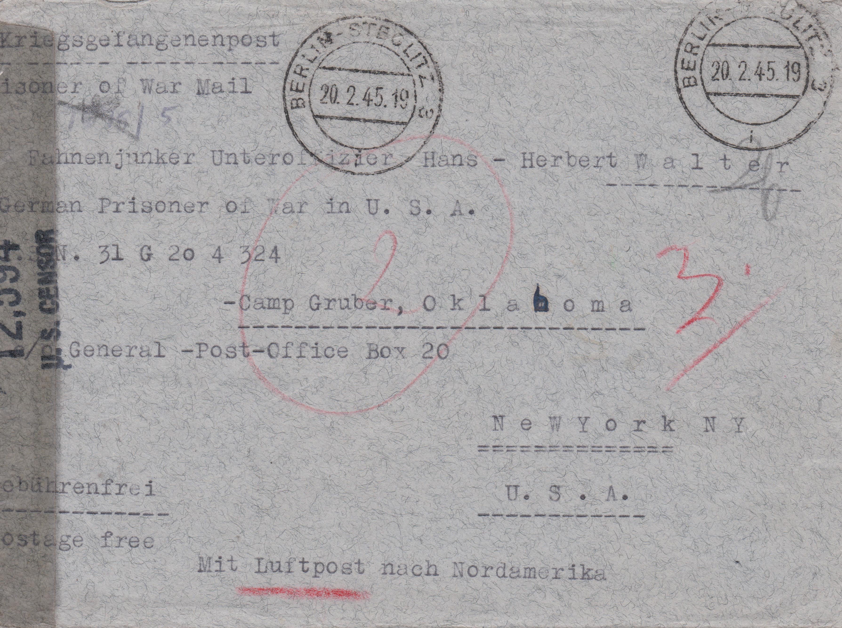 Gebührenfreie Kriegsgefangenenpost in die USA mit Doppelzensur, aufgegeben am 20.02.1945 beim Postamt BERLIN-STRELITZ 3: