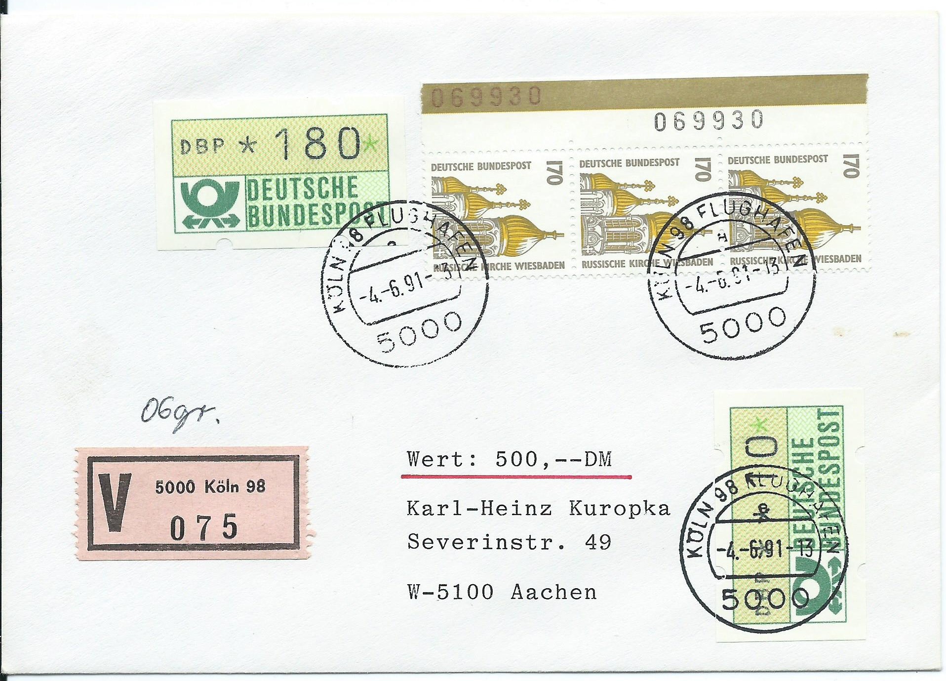 Als letzten Beleg für heute zeige ich den Wert zu 5,50 Pf im senkrechten 4-er-Streifen mit Bogenzählnummern zusammen mit einer ATM zu 100 Pf. Hier sind wohl alle Möglichkeiten ausgereizt, die auf einer Sendung machbar sind: Eil-Wertbrief Eigenhändig und Rückschein. Geht noch mehr? Ich denke nein. Abgestempelt wurde der Beleg in Köln 98 am 11.8.94, hier schon mit 5-stelliger Postleitzahl und ohne den Zusatz Flughafen.