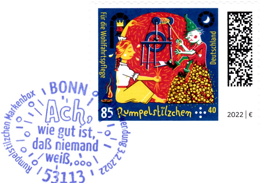 Klappkarte des Vorstandsvorsitzenden der Deutschen Post AG mit den drei Wohlfahrtsmarken 2022 (MiNr 3464 bis 3466) mit Motiven zu Grimms Märchen "Rumpelstilzchen" und und dem Ersttagsonderstempel Bonn.