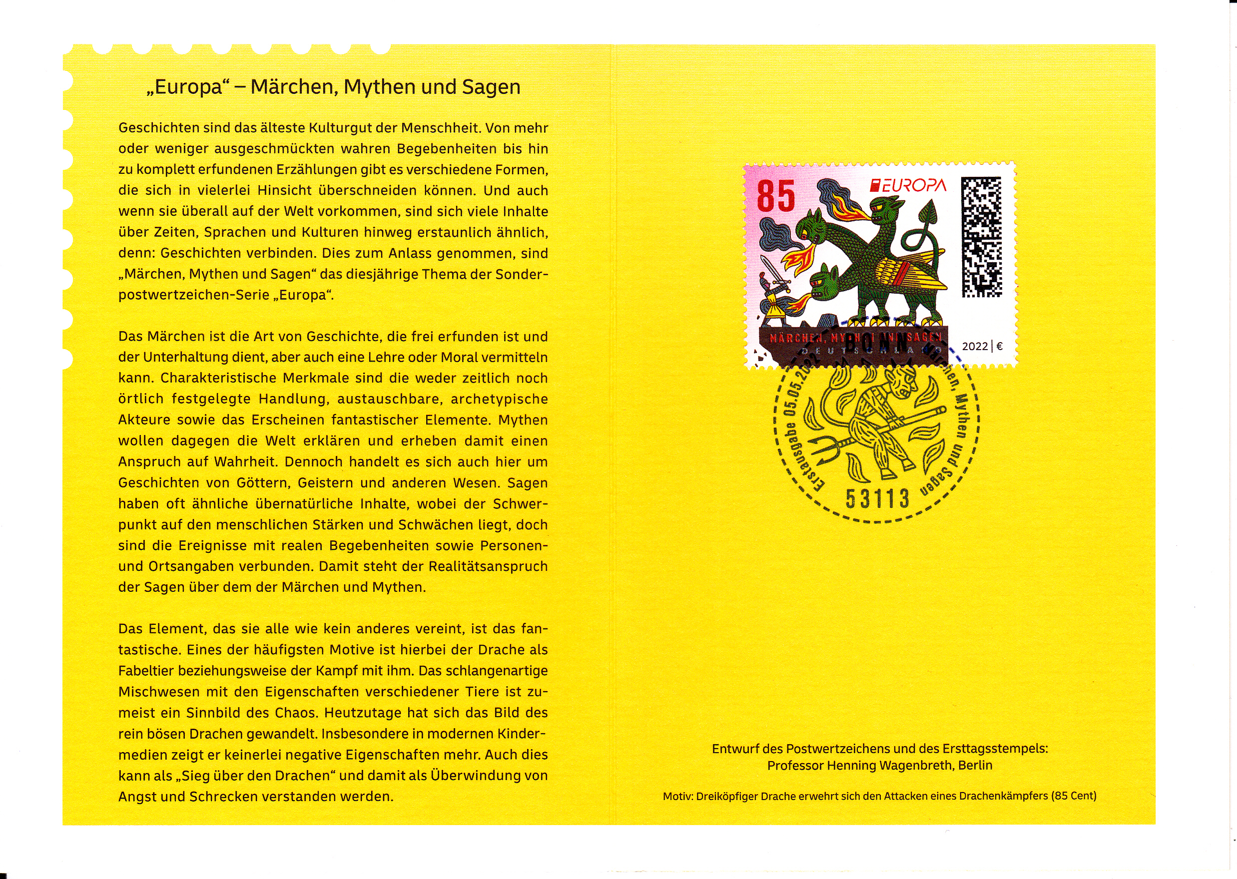 Klappkarte des Vorstandsvorsitzenden der Deutschen Post AG mit der Europamarke 2022 (MiNr 3687)mit der Abbildung "Ritter kämpft gegen dreiköpfigen Drachen" und dem Ersttagsonderstempel Bonn.