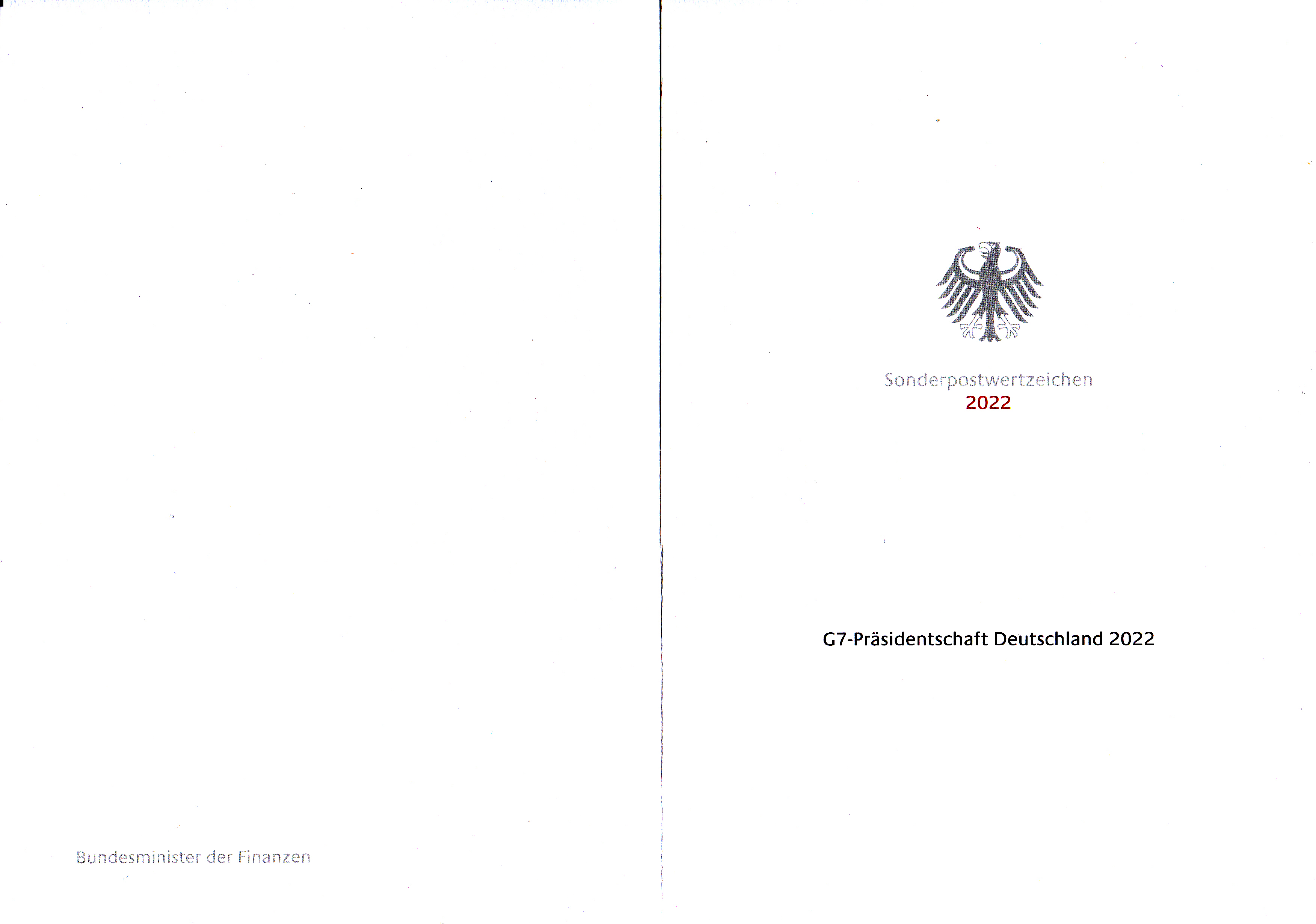 Ergänzend zu der bereits gezeigten farbige Ministerkarte des Bundesministers für Finanzen folgt nun auch die weiße Ministerkarte mit zwei Marken "G7-Präsidentschaft Deutschlands 2022" (MiNr 3694) und den beiden Ersttagsonderstempel Bonn und Berlin.
