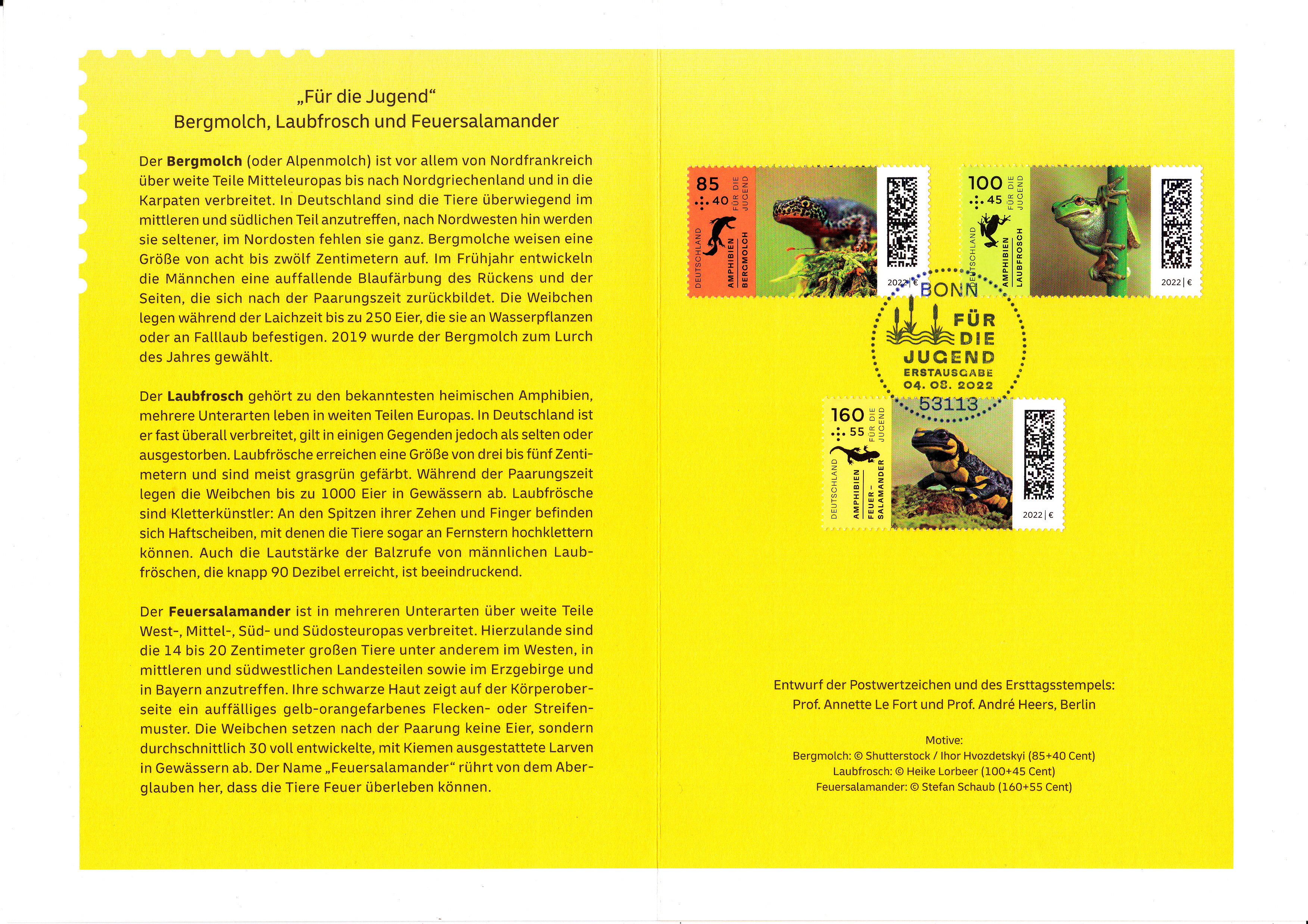 Klappkarte des Vorstandsvorsitzenden der Deutschen Post AG mit je einer Marke für die Jugend 2022 (MiNr 3706 bis 3708) mit Motiven zum Thema "Amphibien". Die Marken sind mit den Ersttagsonderstempel Bonn gestempelt.
