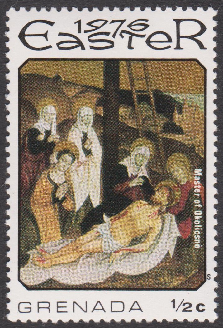 Grenada MiNr. 741 erschien am 29.03.1976 in einem Satz "Ostern: Gemälde" und zeigt das Gemälde "Kreuzabnahme" vom "Meister von Okolicsno":
