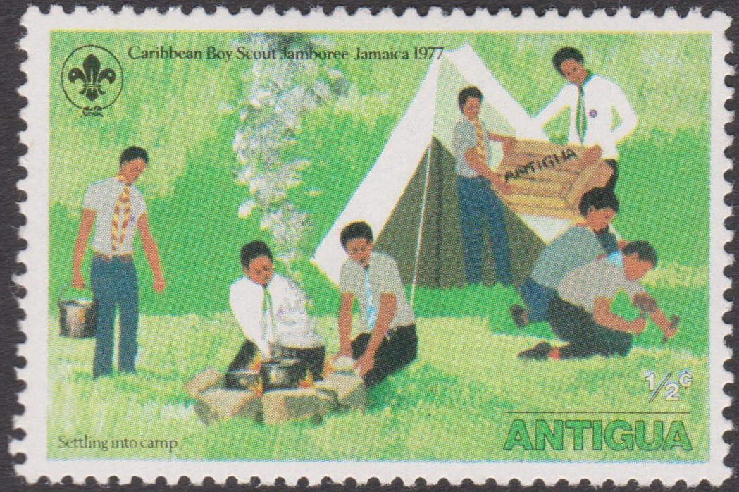 Antigua MiNr. 459 erschien am 23.05.1977 aus Anlaß "Karibisches Pfadfindertreffen" und zeigt Pfadfinder im Zeltager: