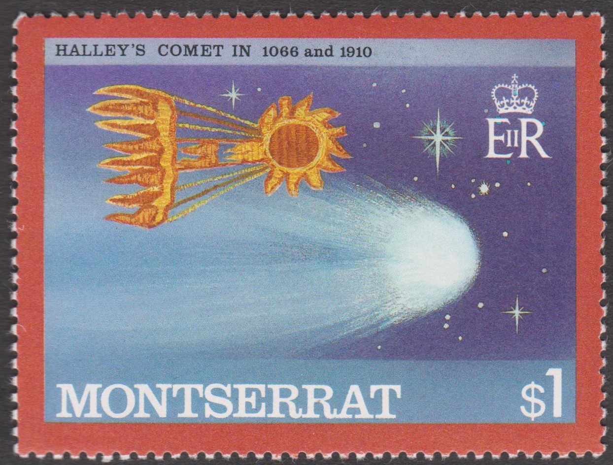 Montserrat MiNr. 625 zeigt Darstellungen des Halleyschen Kometen: eine Stickerei aus dem Jahr 1066 sowie ein Foto aus dem Jahr 1910: