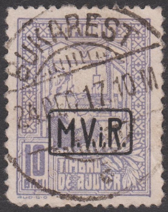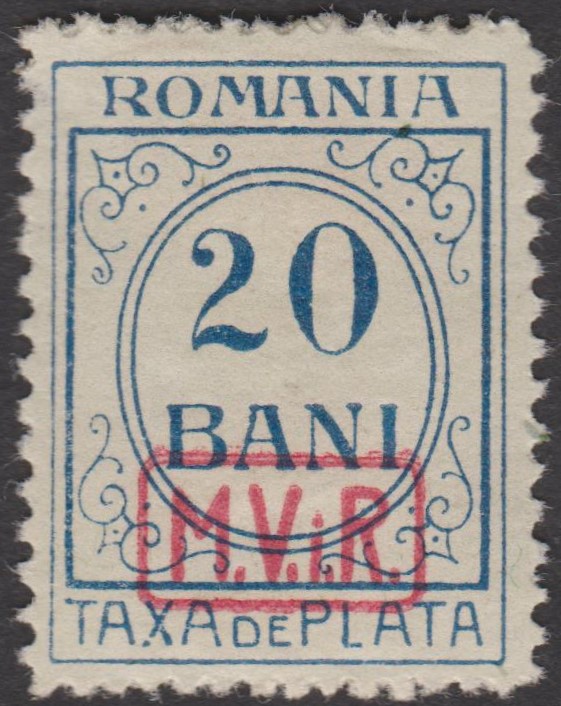 Diese 1918 erschienene Kriegssteuer-Portomarke der Militärverwaltung in Rumänien, MiNr. P 8, wurde hergestellt, indem die Zwangszuschlagsportomarke, Rumänien MiNr. 4, von der Staatsdruckerei Bukarest mit einem schwarzen Buchdruck-Aufdruck "M.V.i.R." versehen wurde: