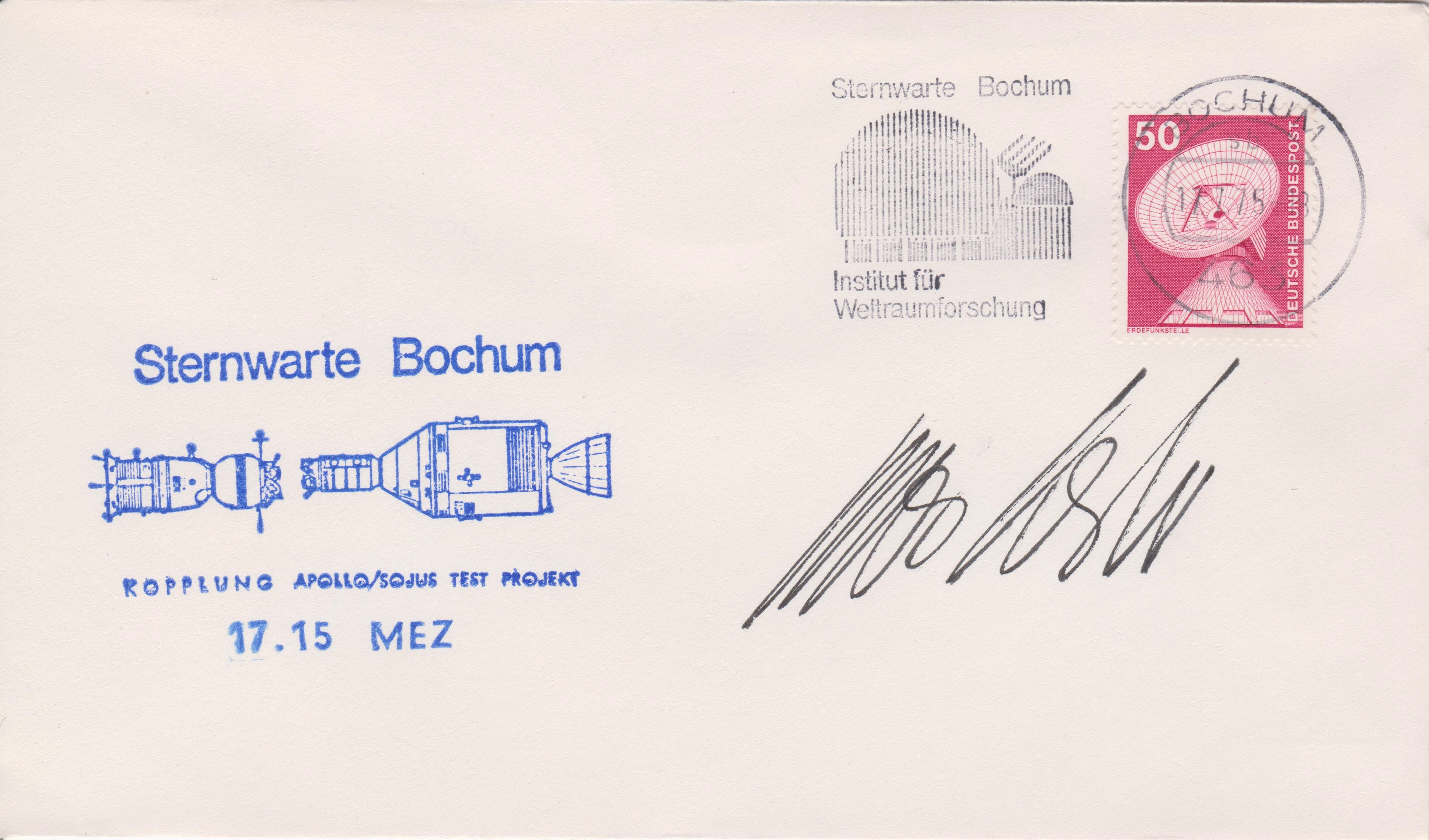 Die "Sternwarte Bochum" legte zum "KOPPLUNG APOLLO/SOJUS TEST PROJEKT" einen Hinweisstempel in Blau auf, hier am 17.07.1975 um 18 Uhr abgeschlagen auf einem nicht gelaufenen Beleg mit passendem Maschinenstempel mit Werbeeinsatz "Sternwarte Bochum Institut für Weltraumforschung":