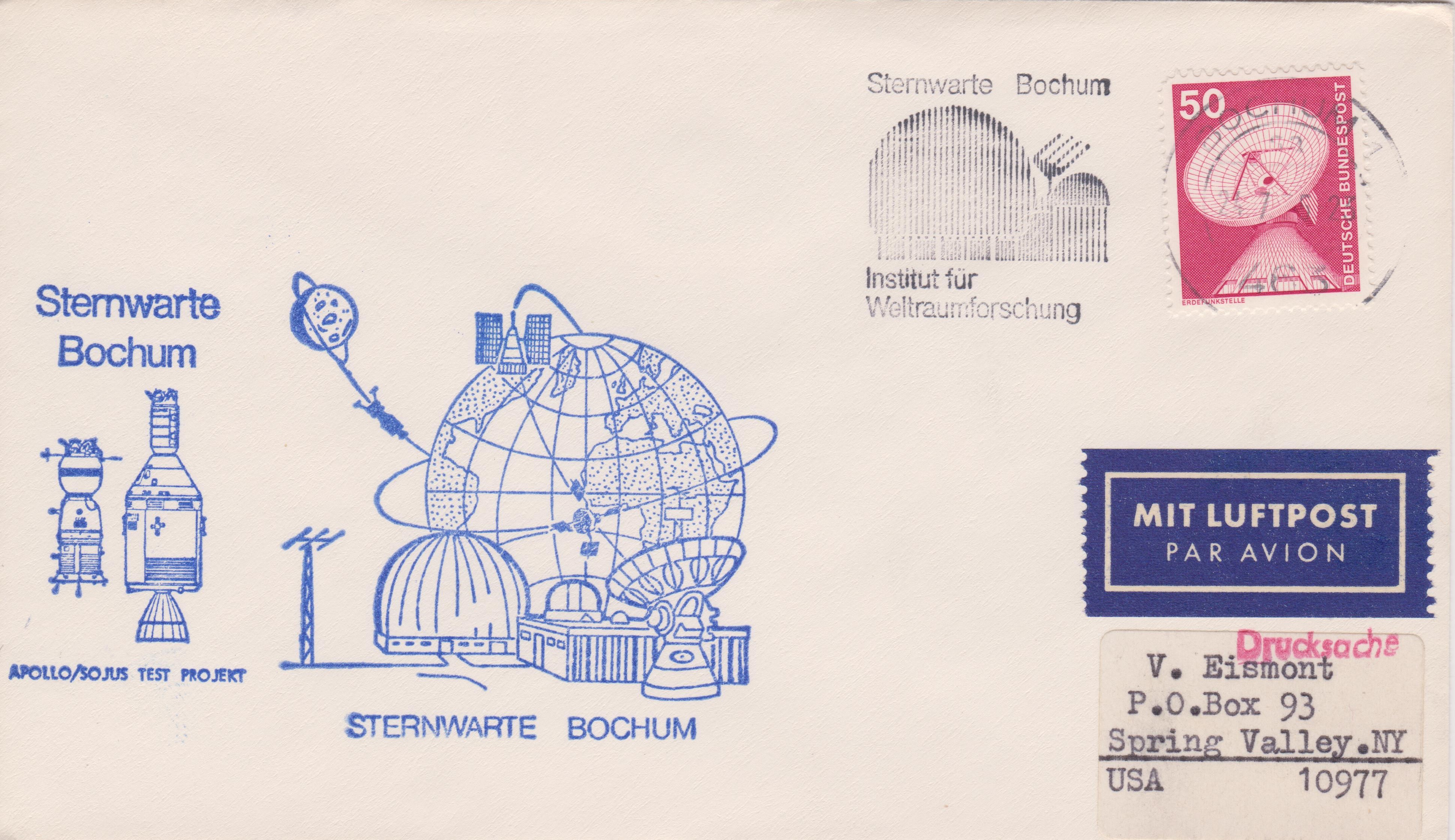Cachetstempel der Sternwarte Bochum zum "APOLLO/SOJUS TEST PROJEKT", am 24.07.1975 auf Drucksache in die USA per Luftpost: