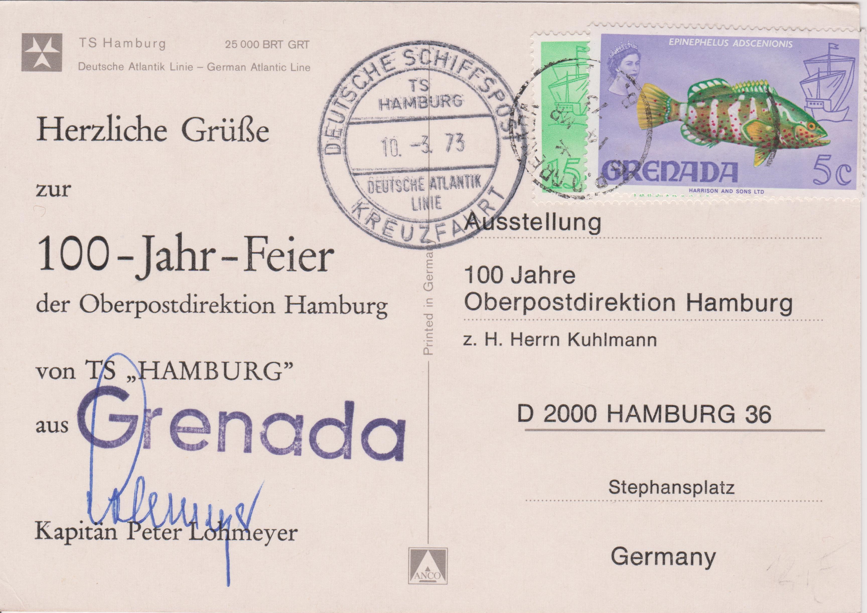 Diese Ansichtskarte wurde an Bord der TS "HAMBURG" vom Kapitän Peter Lohmeyer unterschrieben und auf Grenada der Post übergeben: