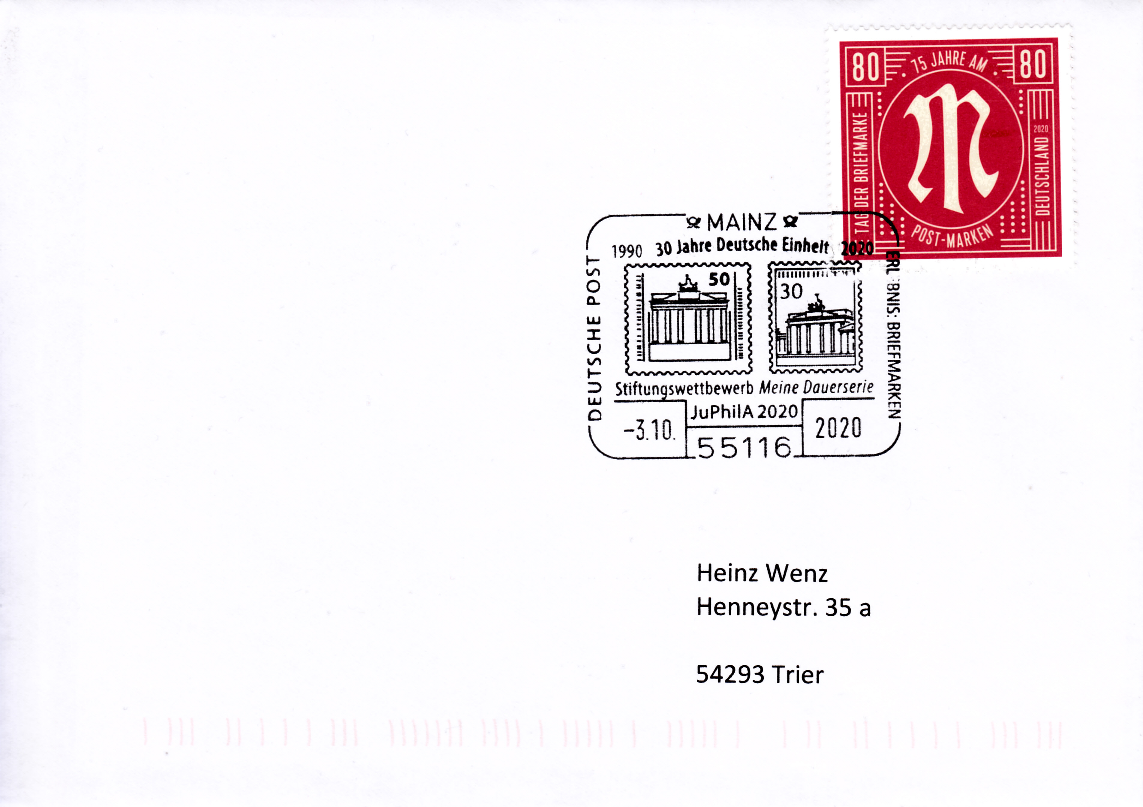 Im Sonderstempel aus Mainz vom 3.10.2020 zum Stiftungswettbewerb "Meine Dauerserie" werden zwei Briefmarken abgebildet: DDR MiNr 3346 und Bundesrepublik MiNr 508.