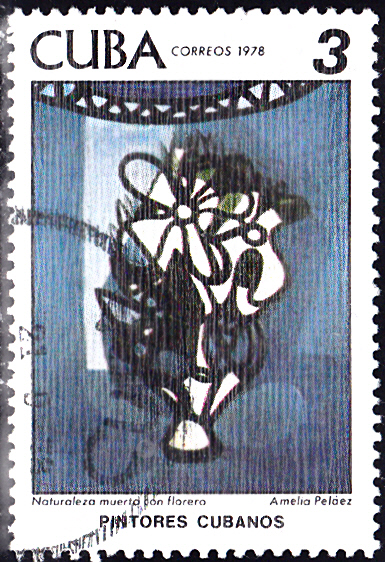 Diese Marke (MiNr 2338) der gleichen Serie zeigt ein "Stillleben mit Blumen" von Amelia Peláez del Casal.