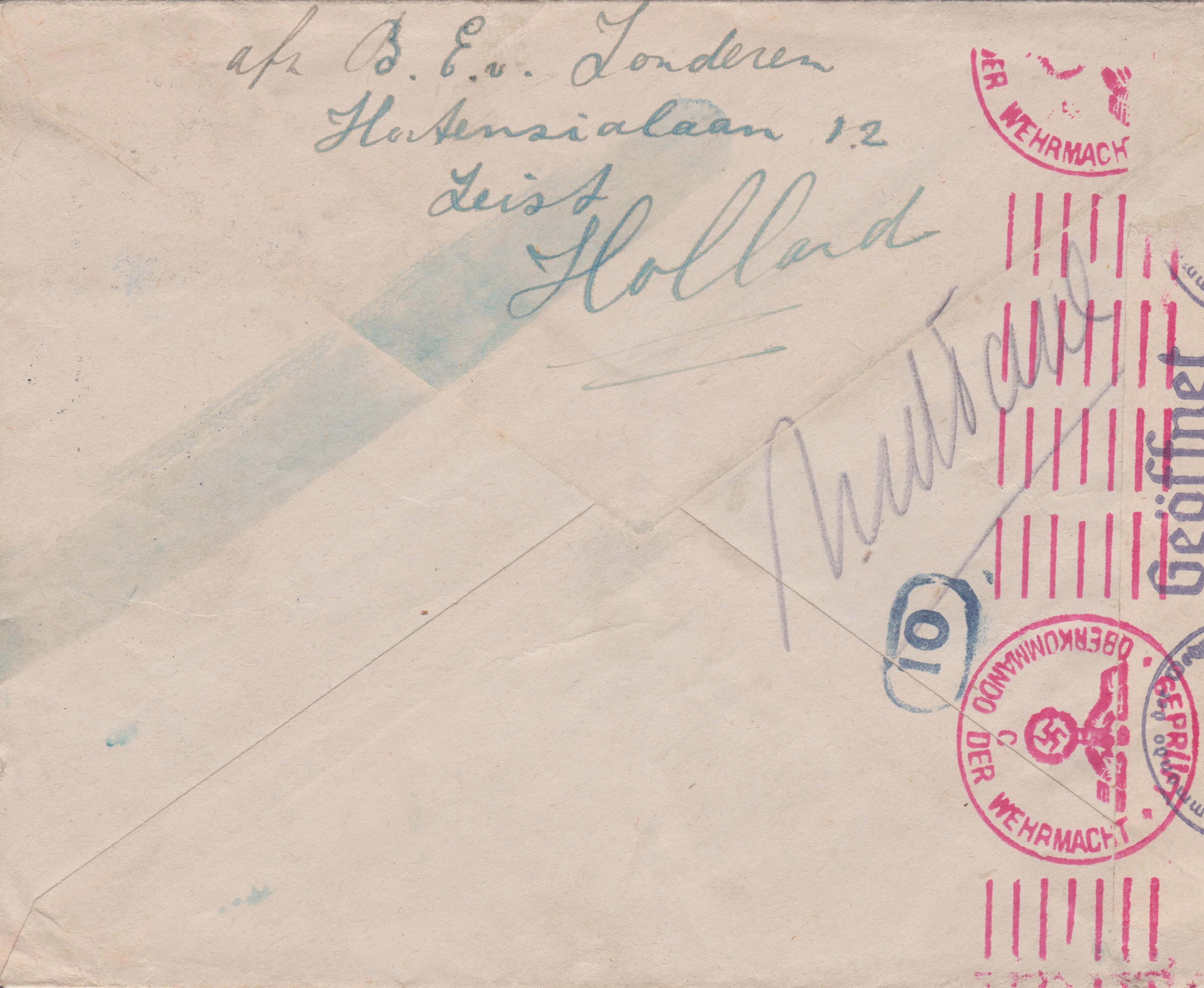 Dieser portogerecht mit 12 Pf frankierte, in "Panker über Lütjenburg (Ostholst)" aufgegebene, nach "den Haag Holland" adressierte Brief wurde der ABP Köln zugeleitet, wo er linksseitig geöffnet und vorderseitig sowie rückseitig mit jeweils drei verschiedenen Chemikalien chemisch zensiert wurde: