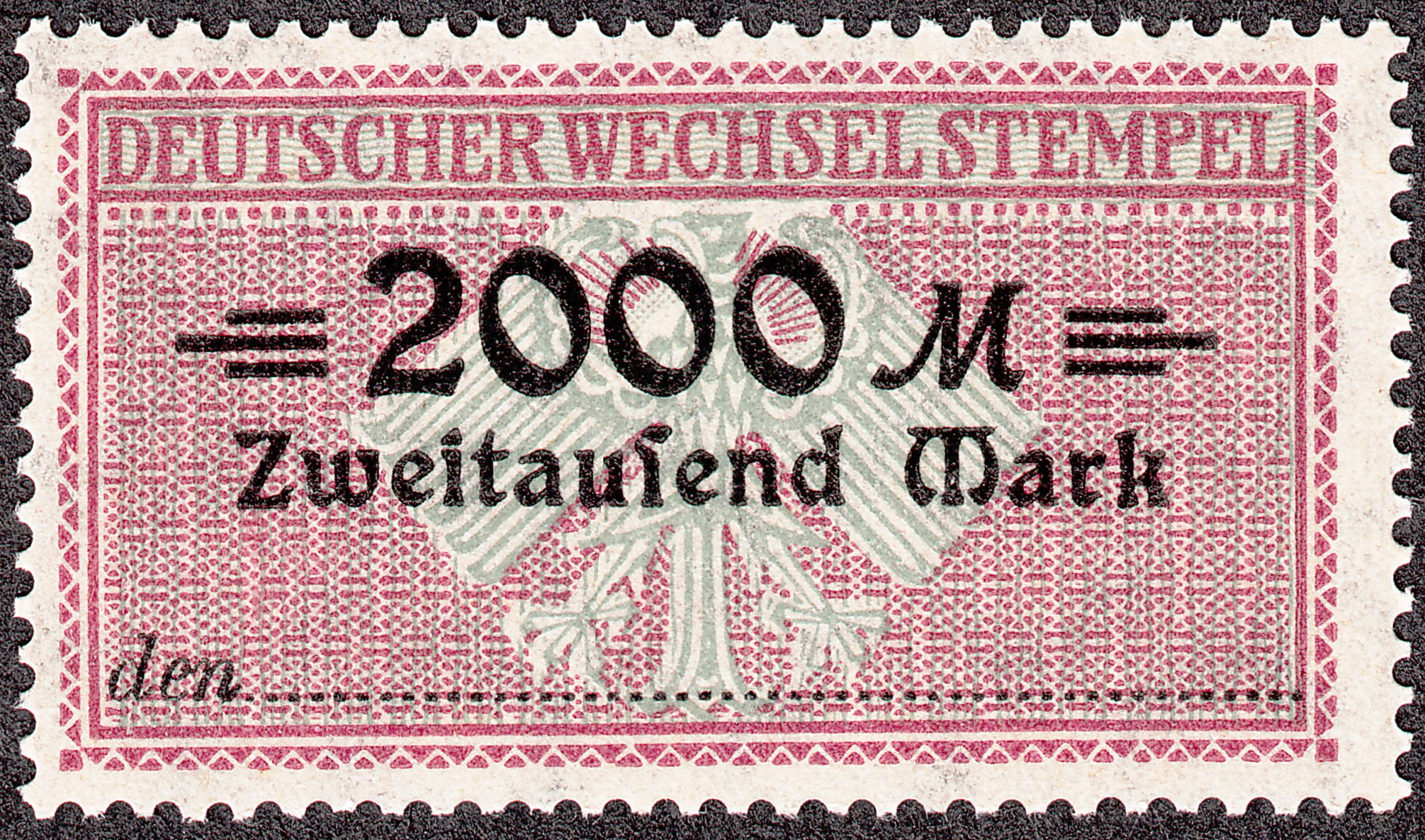 Bis in die Zeit der Inflation hinein wurden im Deutschen Reich als Wechselsteuermarken solche Fiskalmarken mit der Inschrift "DEUTSCHER WECHSEL STEMPEL" verausgabt, hier vier Marken mit den Wertstufen 1000 Mark / 2000 Mark / 3000 Mark / 5000 Mark:
