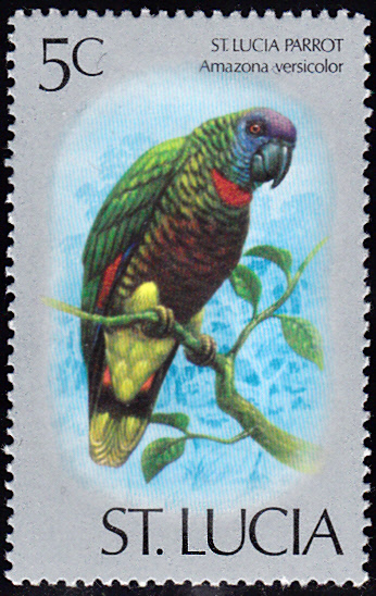 Auf dieser Marke aus dem Jahre 1976 aus St. Lucia (MiNr 383) wird eine Blaumaskenamazone (Amazona versicolor) gezeigt.