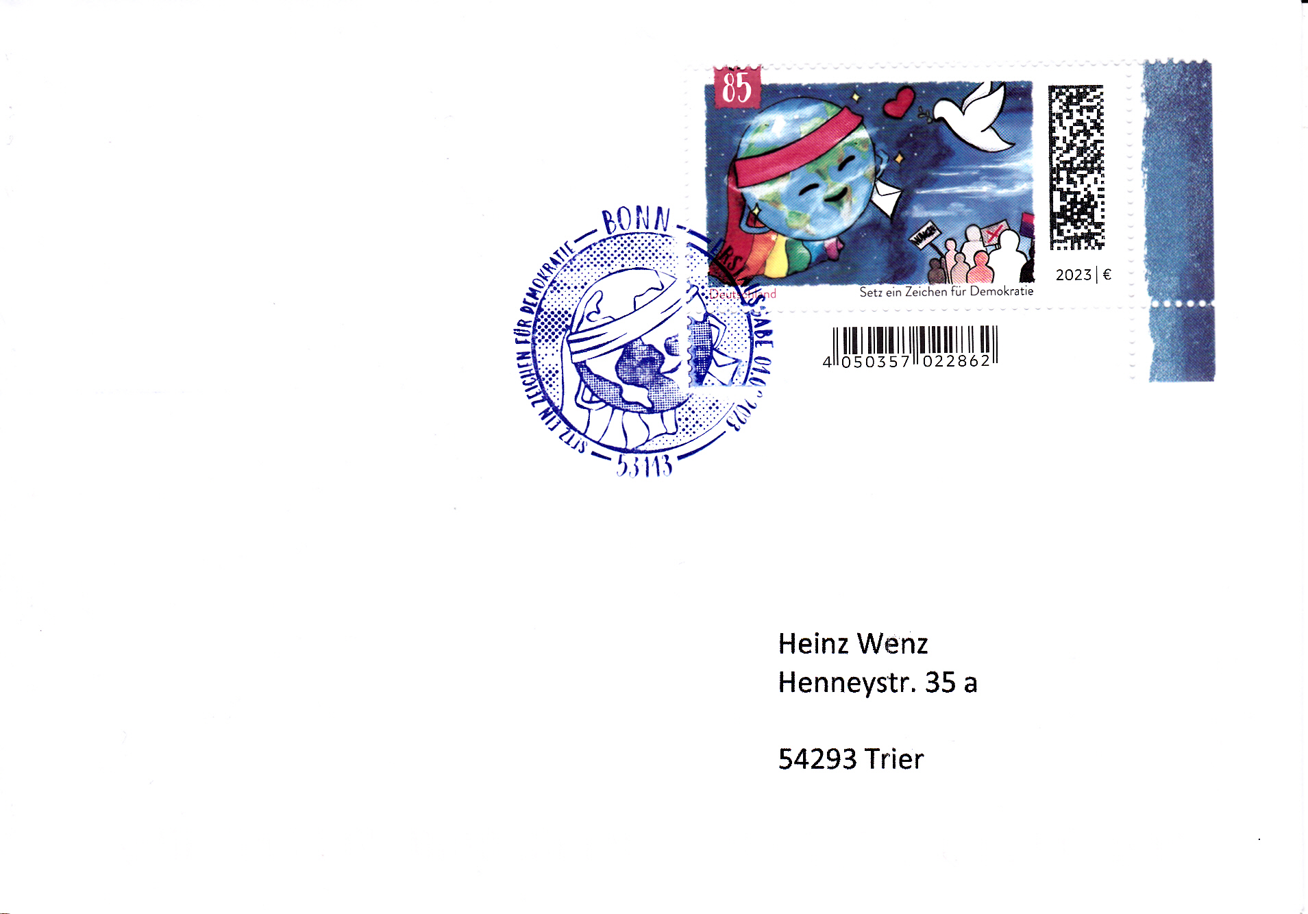 Klappkarte des Vorstandsvorsitzenden der Deutschen Post AG mit einer Marke (MiNr 3769) zum Thema "Demokratie" mit der Abbildung "Lächelnde Weltkugel mit Regenbogen-Stirnband, Friedenstaube und demonstrierenden Menschen" nach dem Siegerentwurf des Postwertzeichen-Malwettbewerbs "Setz ein Zeichen für Demokratie" von Leonie Hansen (16 Jahre) und dem Ersttagsonderstempel Bonn.
