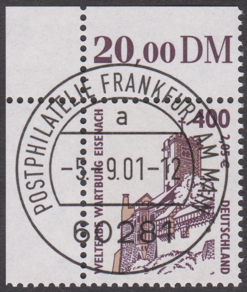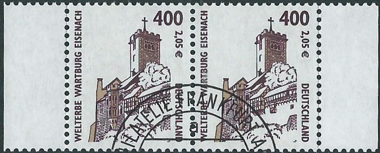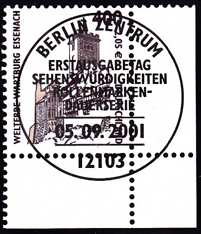 Am 5.9.2001 wurde die Marke zu 400Pf/2,05 € verausgabt, sie zeigt als Motiv die Wartburg bei Eisenach. Hier eine Marke vom linken unteren Bogenrand: