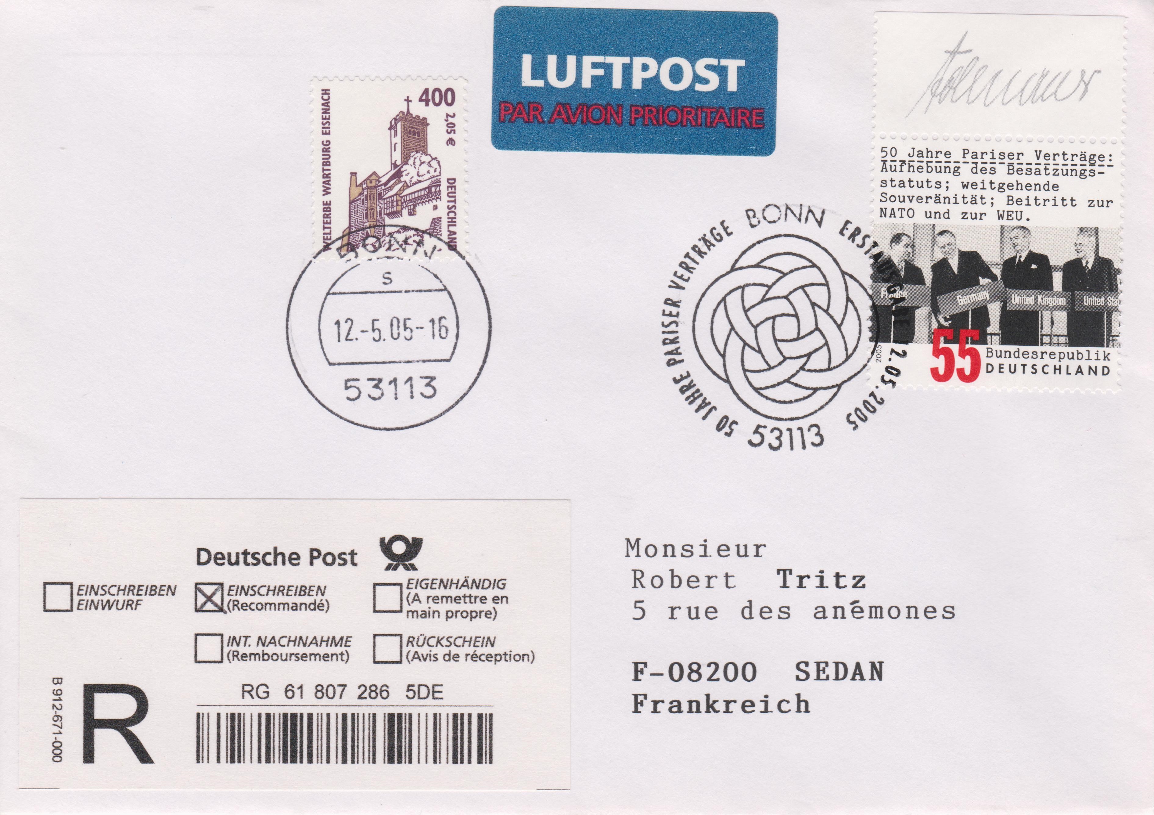 MiNr 2211 am 12.05.2005 als Zusatzfrankatur auf einem Ersttagsbrief der Sondermarke "50 Jahre Pariser Verträge" per Einschreiben nach Frankreich: