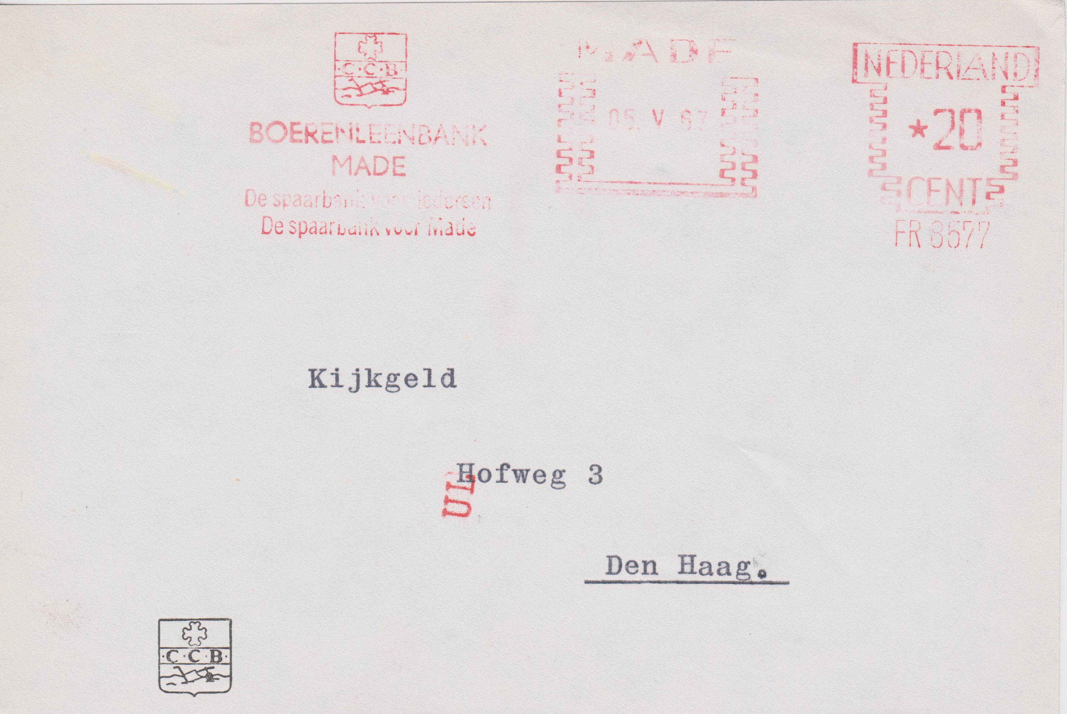 Ausschnitt aus einem Brief mit einem Absenderfreistempel vom 05.05.1967 aus MADE nach Den Haag (= 's-GRAVENHAGE):