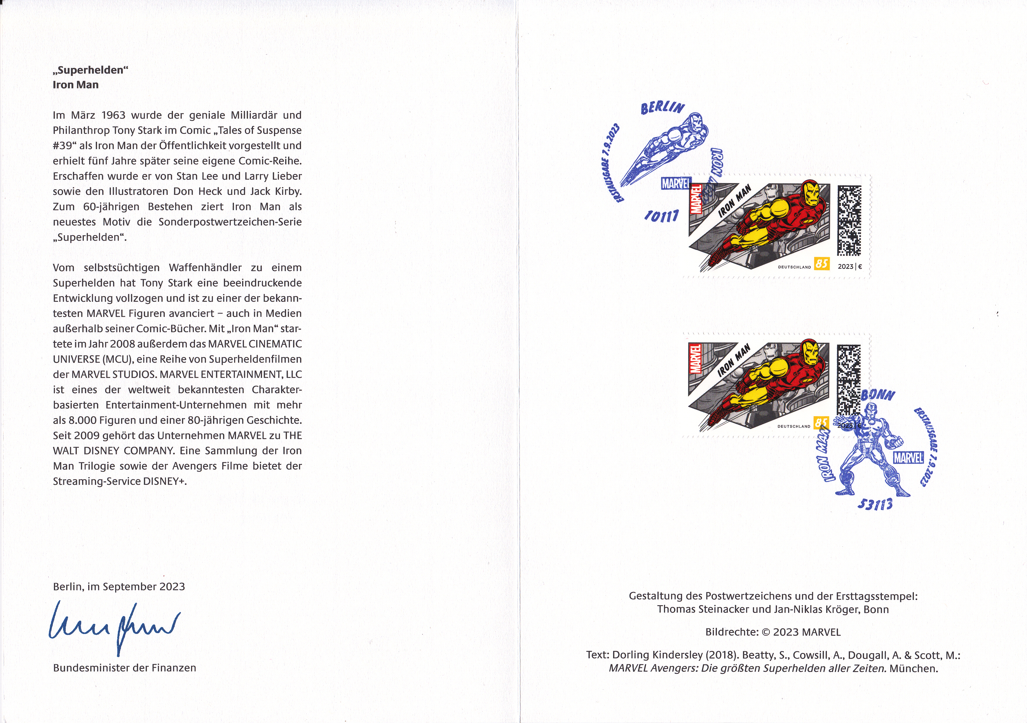 Ministerkarte des Bundesministers für Finanzen mit zwei Marken (MiNr 3783) mit dem Motiv "Wandmalerei „Past and Future“ von Claudia Walde (geb.1980) alias „MadC“, deutsche Graffiti-Künstlerin" aus der Serie "Street Art " und den beiden Ersttagsonderstempel Bonn und Berlin.