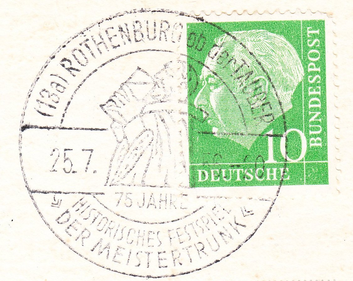 Bürgermeister Georg Nusch stellt sich der übermenschlichen Aufgabe - und schafft den "Meistertrunk", was in diesem Handwerbestempel aus dem Jahre 1956 zu sehen ist: