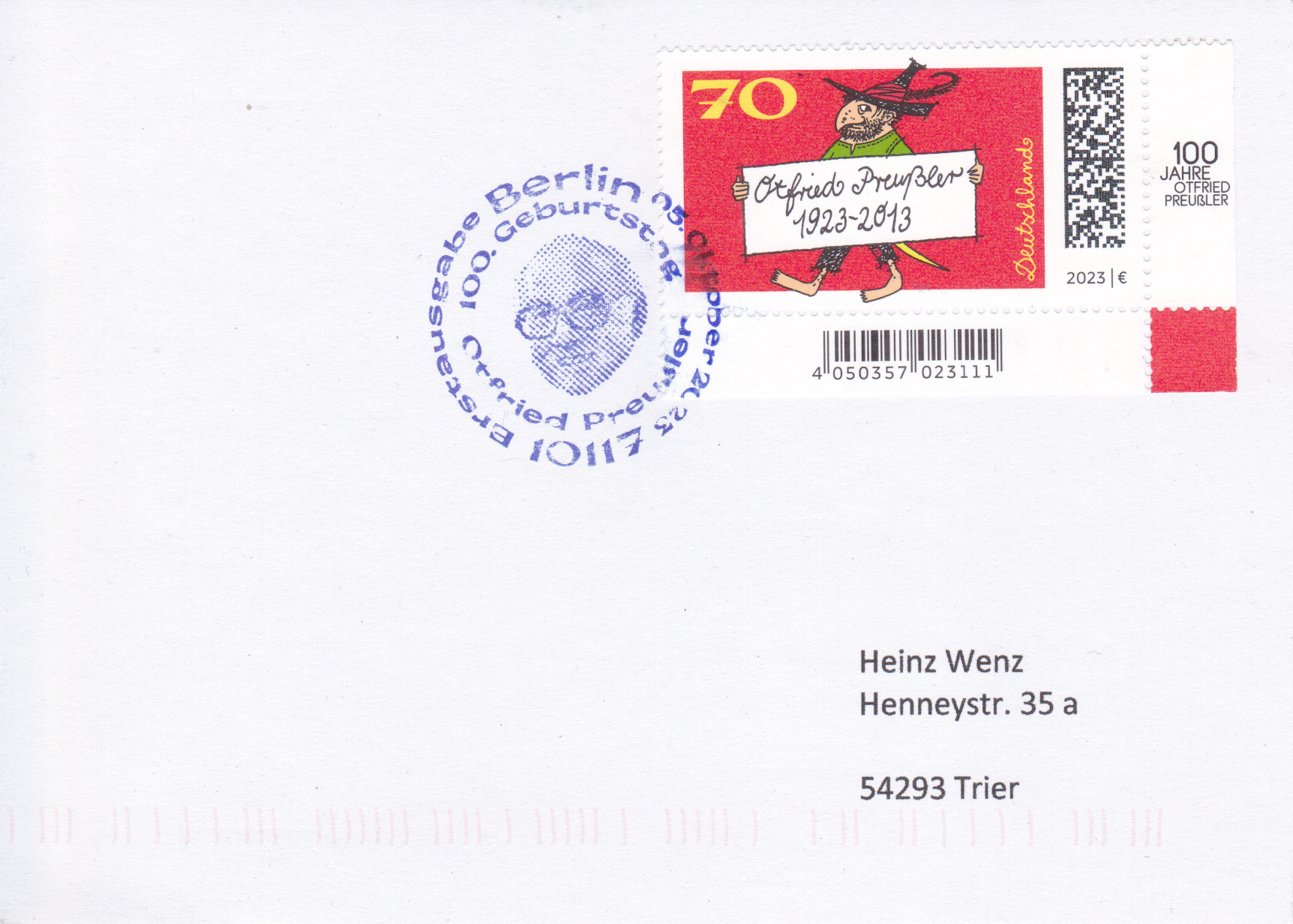 Postkarte mit der Marke zum 100. Geburtstag von Otfried Preußler und dem Ersttagsonderstempel aus Berlin.