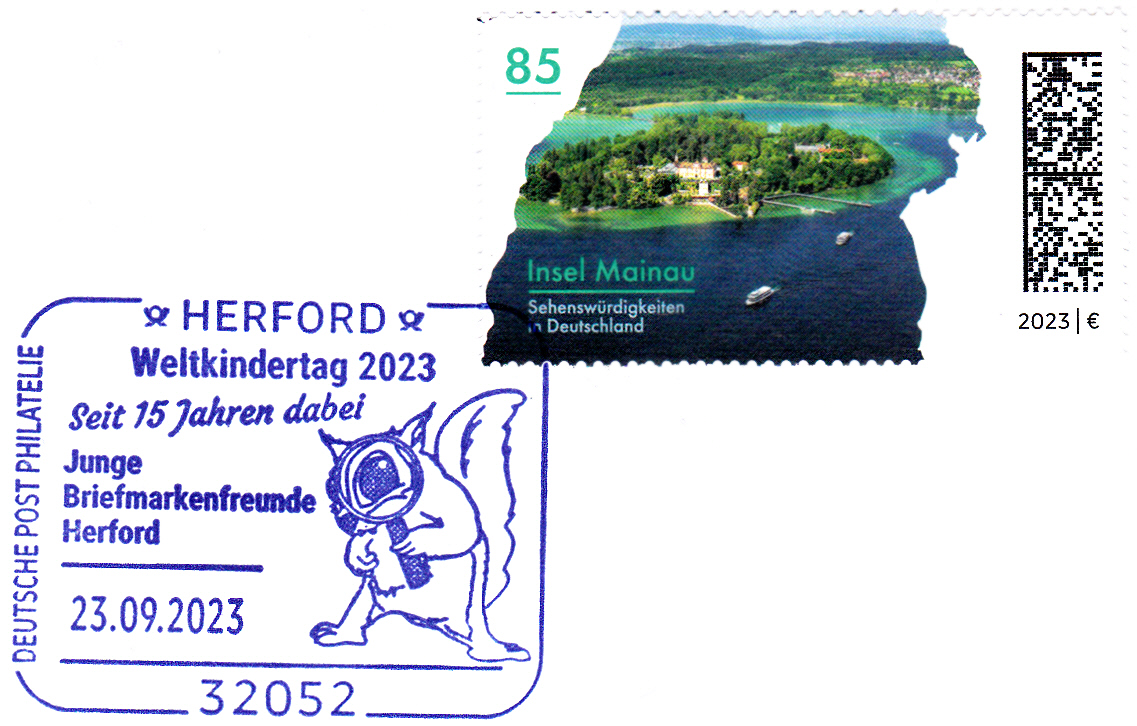 Auf dieser Marke der Deutschen Post (MiNr 3798) zeigt eine kubistische Darstellung zweier Eichhörnchen (Sciurus vulgaris) mit Eichel in einer Winterlandschaft. Hier bilde ich Eckrandstück mit EAN-Codier ab ab.