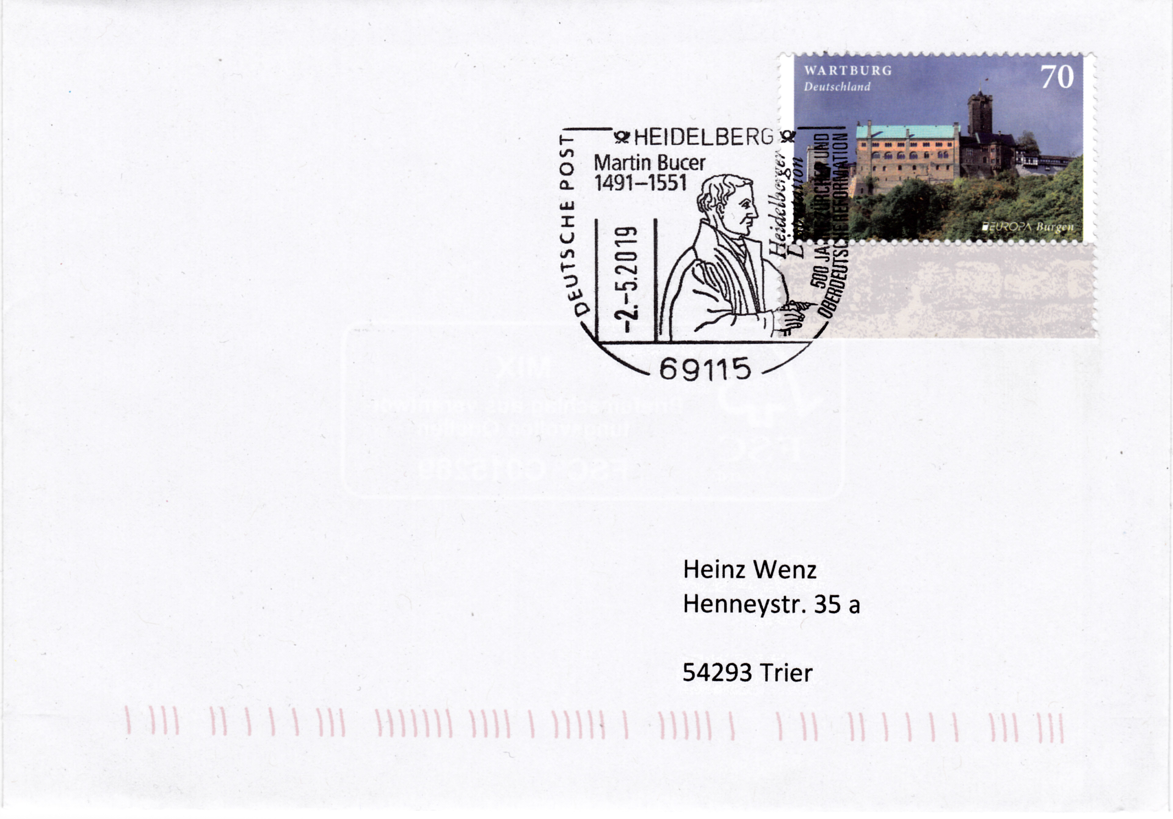 Der Sonderstempel vom 2.5.2019 aus Heidelberg erinnert an die Teilnahme von Martin Bucer an der Heidelberger Disputation.