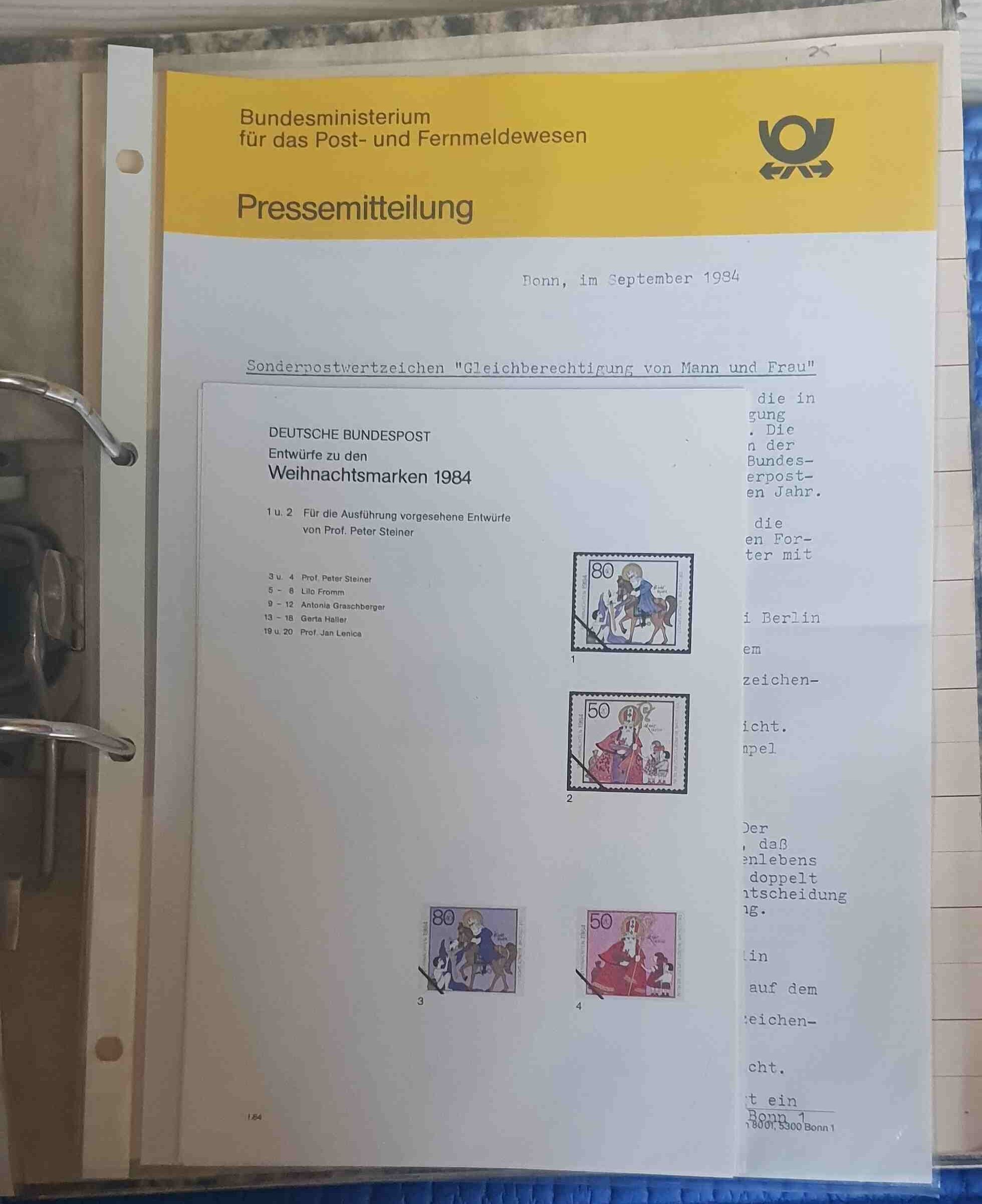 Im Ordner ist auch ein Schriftwechsel vom Leiter einer Motivgruppe mit dem Bundesministerium für das Post- und Fernmeldewesen in dem es um den Bezug dieser Entwürfe geht. Die Entwürfe sind alle zu den Marken von 1984 bis 1987, augenscheinlich komplett. Ich freue mich über jegliche Antwort.