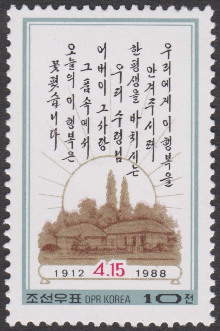 Nordkorea MiNr. 2911 erschien am 15.04.1988 zum 76. Geburtstag von Kim Il Sung und zeigt sein Geburtshaus: