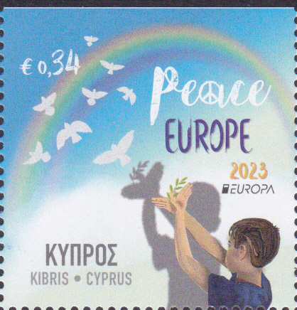 Die Europamarken 2023 sind in Zypern am 6. Mai 2023 zum Thema "Frieden - der höchste Wert der Menschheit" erschienen. Die Marke zu 0,34€ zeigt die Abbildung "Kind formt Schattenspiel-Taube mit Olivenzweig und Tauben im Flug". Die vierseitig gezähnte Marke (MiNr 1509 A) hat eine Auflage von 55.000 Stück. Hier zeige ich eine Marke vom Eckrand.