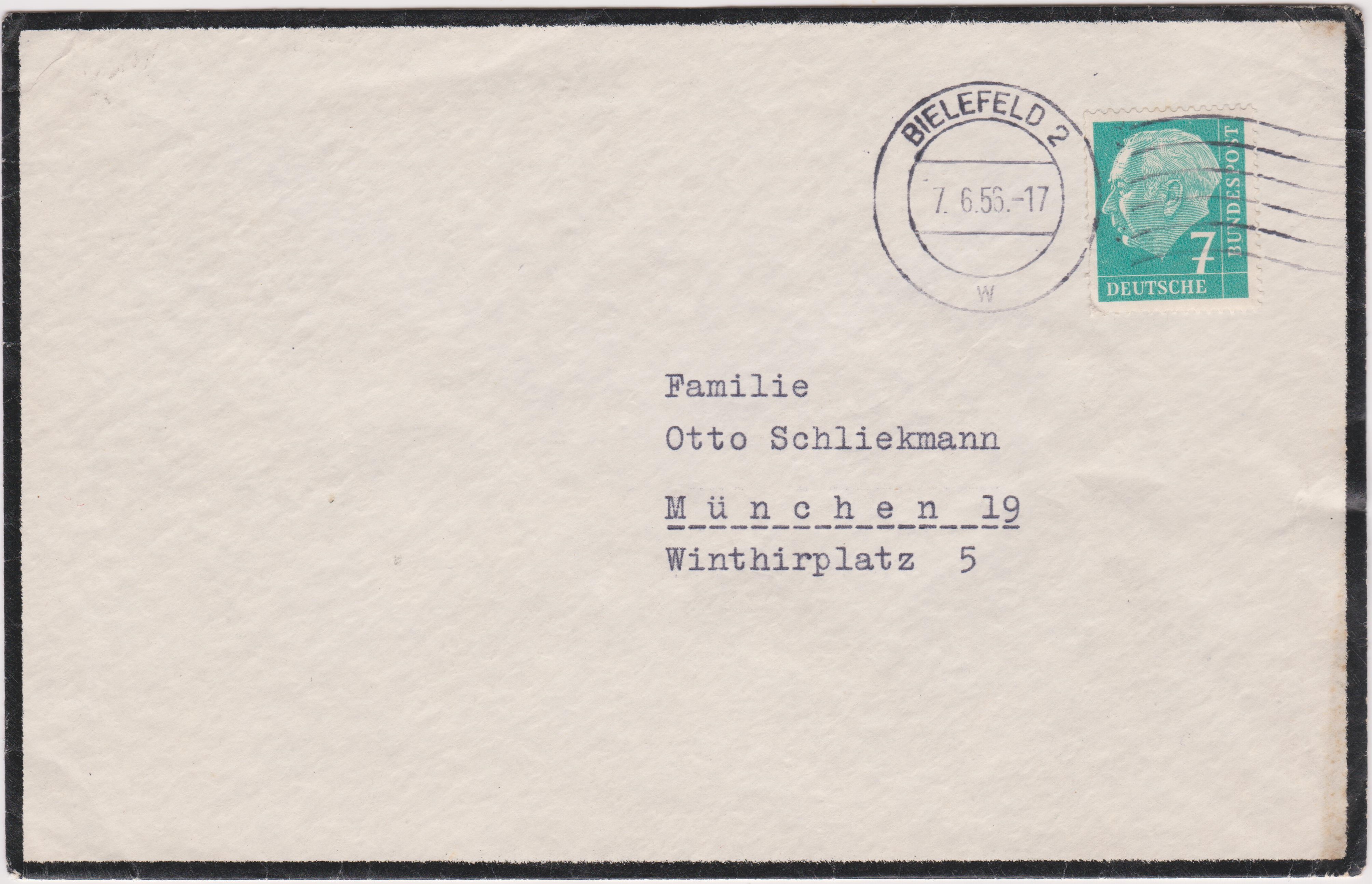 Trauersendung, einer Drucksache entsprechend freigemacht per Einzelfrankatur mit 7 Pf Dauerserie Heuss, am 07.06.1956 gelaufen im Fernverkehr von BIELEFELD 2 nach München 19, entwertet per Maschinenstempel mit Welleneinsatz rechts: