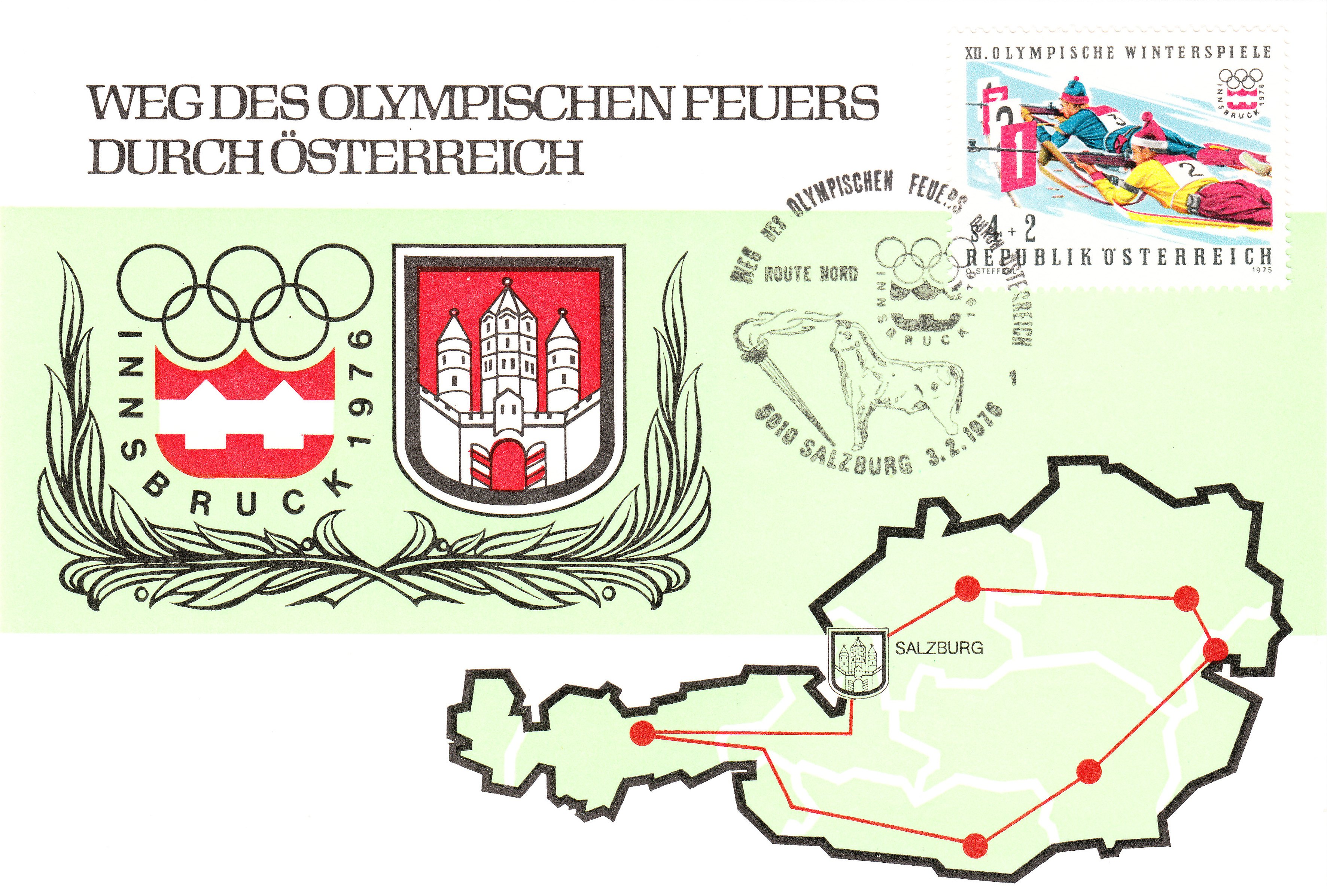 Der bereits von Rüdiger gezeigte Sonderstempel vom 30.1.1976 aus Wien zur Entzündung der Olympischen Fackel in Olympia (Kennziffer "3") wurde hier auf einer Drucksache abgeschlagen.