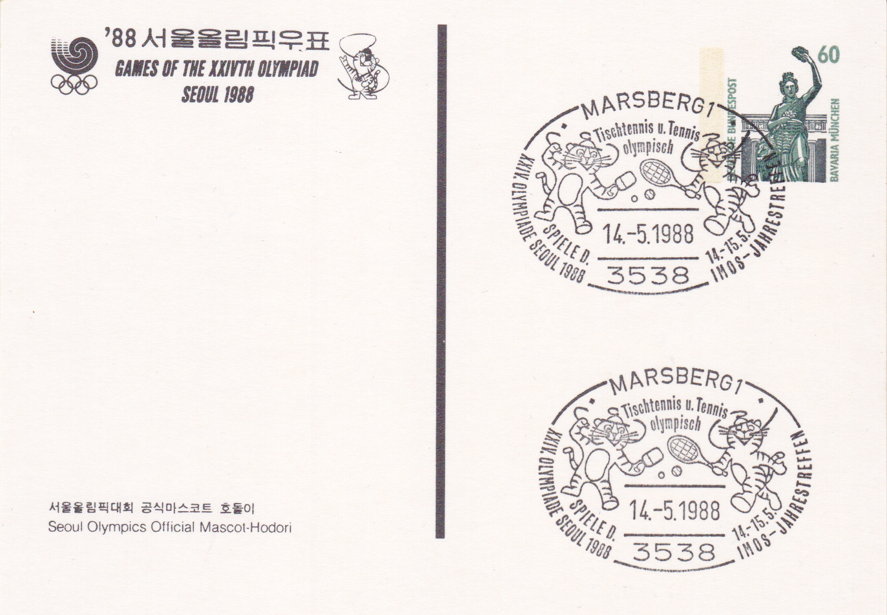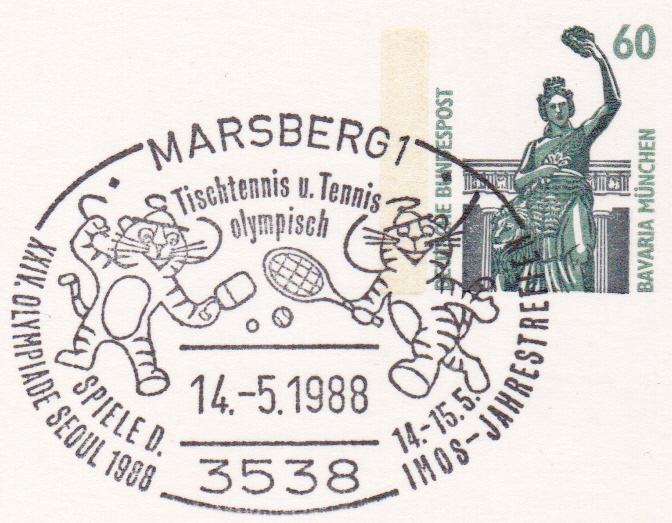 Der Sonderstempel aus Marsberg vom 14.5.1988 zum Jahrestreffen der IMOS zeigt im Stempel das Maskottchen der Sommerspiele 1988.