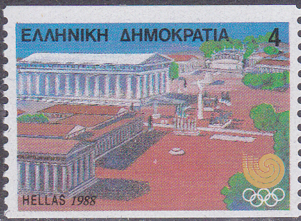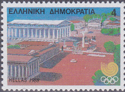 Zu den Sommerspielen in Seoul ist in Griechenland in einer Serie diese Marke (MiNr 1687 A) mit einer Abbildung aus dem antiken Olympia mit dem Zeus-Tempel.