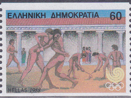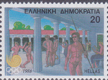 Auf der zweiten Marke der Serie (MiNr 1688) sind Athleten im Gymnastirio abgebildet.